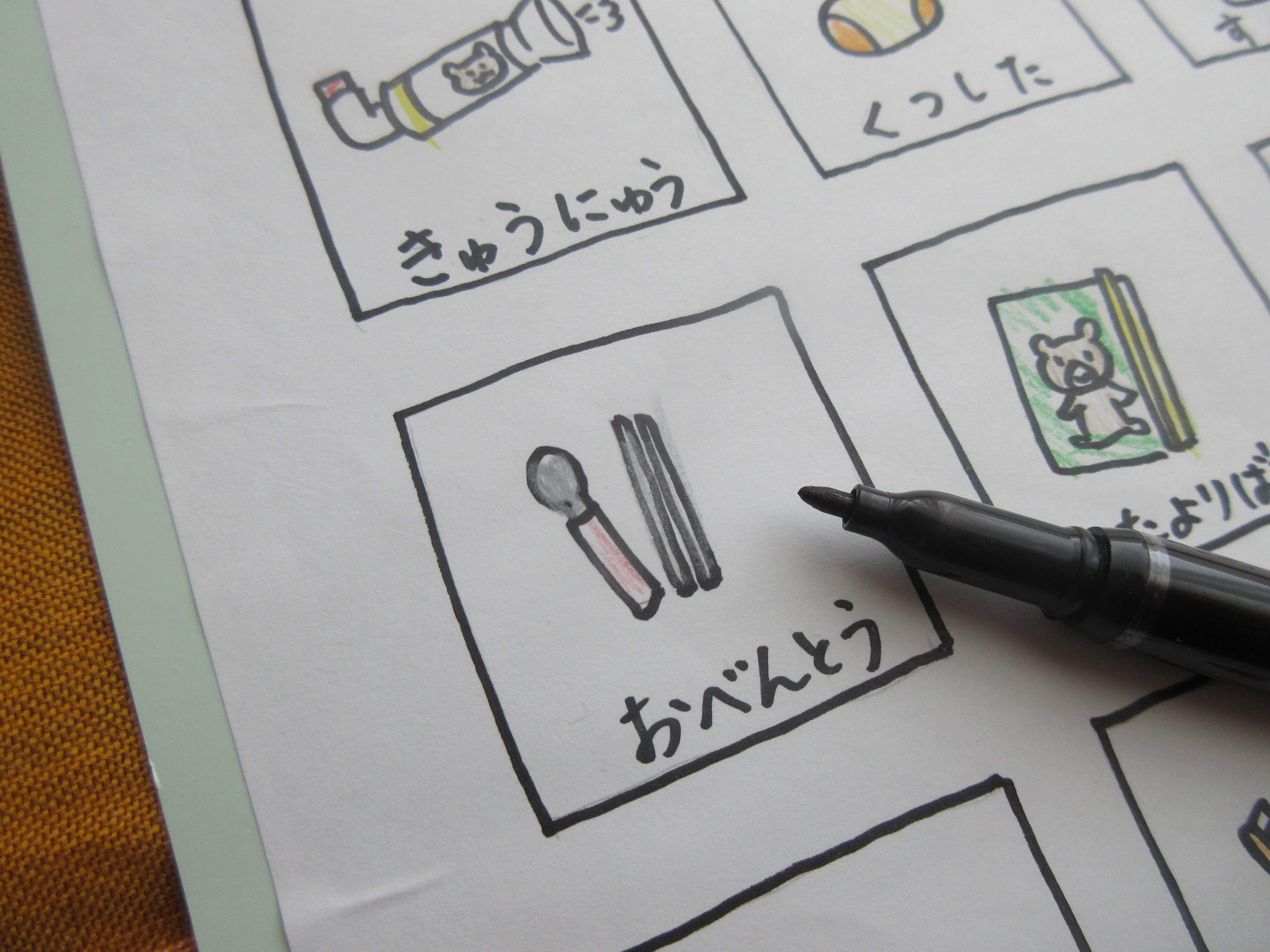 市販のお支度ボードもありますし、手作りボードの作り方も紹介されていましたが、お金がかかるし、使いこなせるか分からなかったので、まずは自分で簡単に紙にリストを絵で描いてみることにしました。