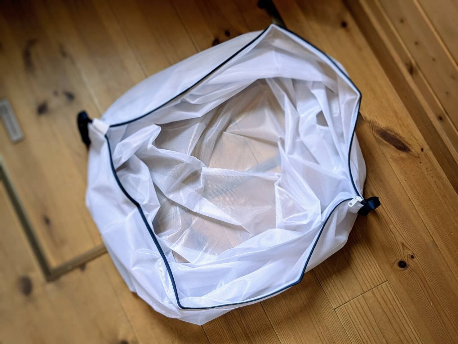 布団やラグなどの大物を入れる時に助かるのが、この大きく開く口です!いくら中が広くても、口が小さいと出し入れが大変ですが、ここまで大きく開くのでノンストレス。筆者宅では、衛生面が気になる子どもたちのぬいぐるみも、この洗濯ネットに入れて洗濯しています。大容量のお陰で、一気に洗濯できるのが助かりますね。