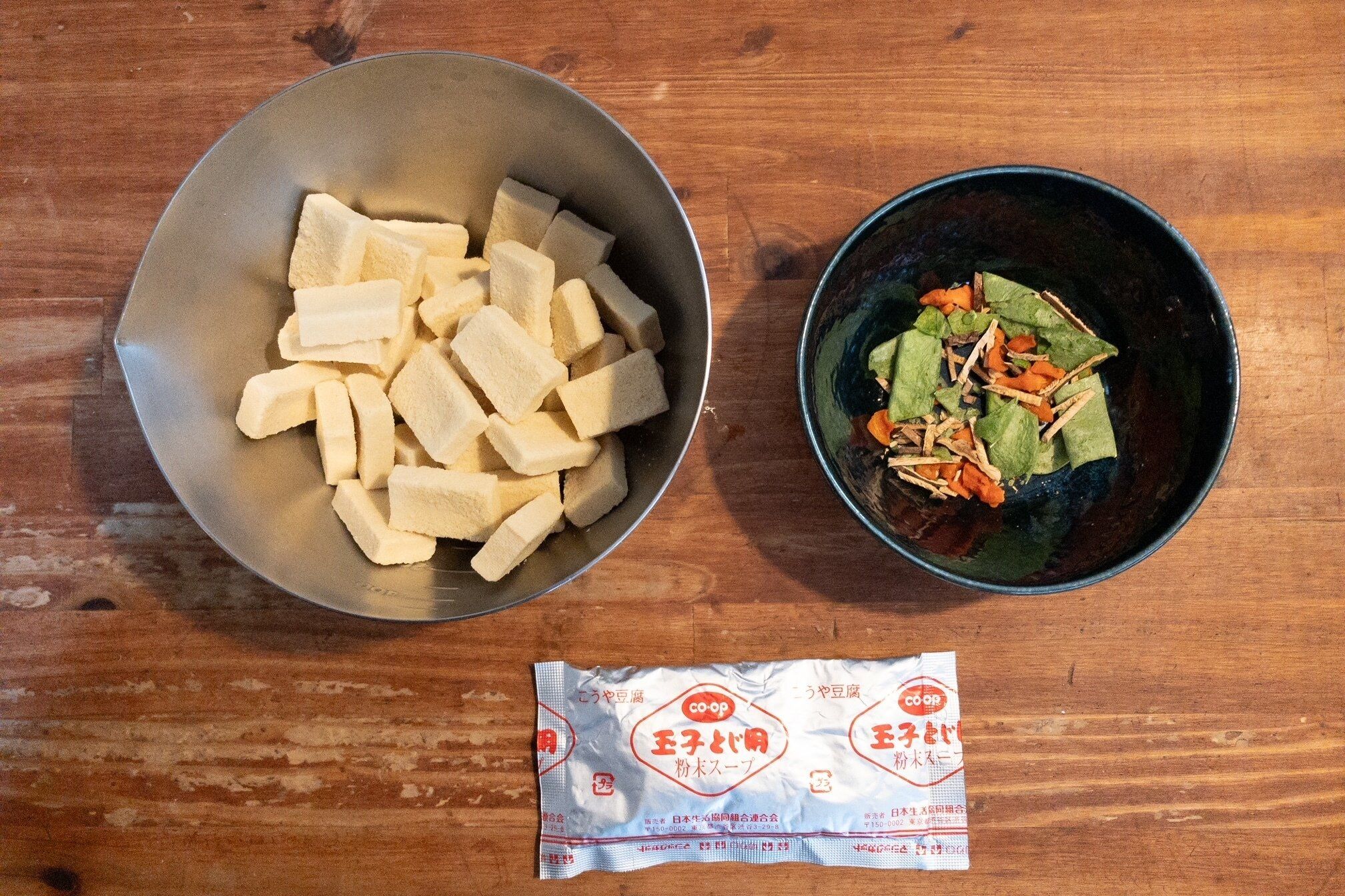 薄くスライスされた高野豆腐、粉末だし、乾燥具材(しいたけ、きぬさや、にんじん)