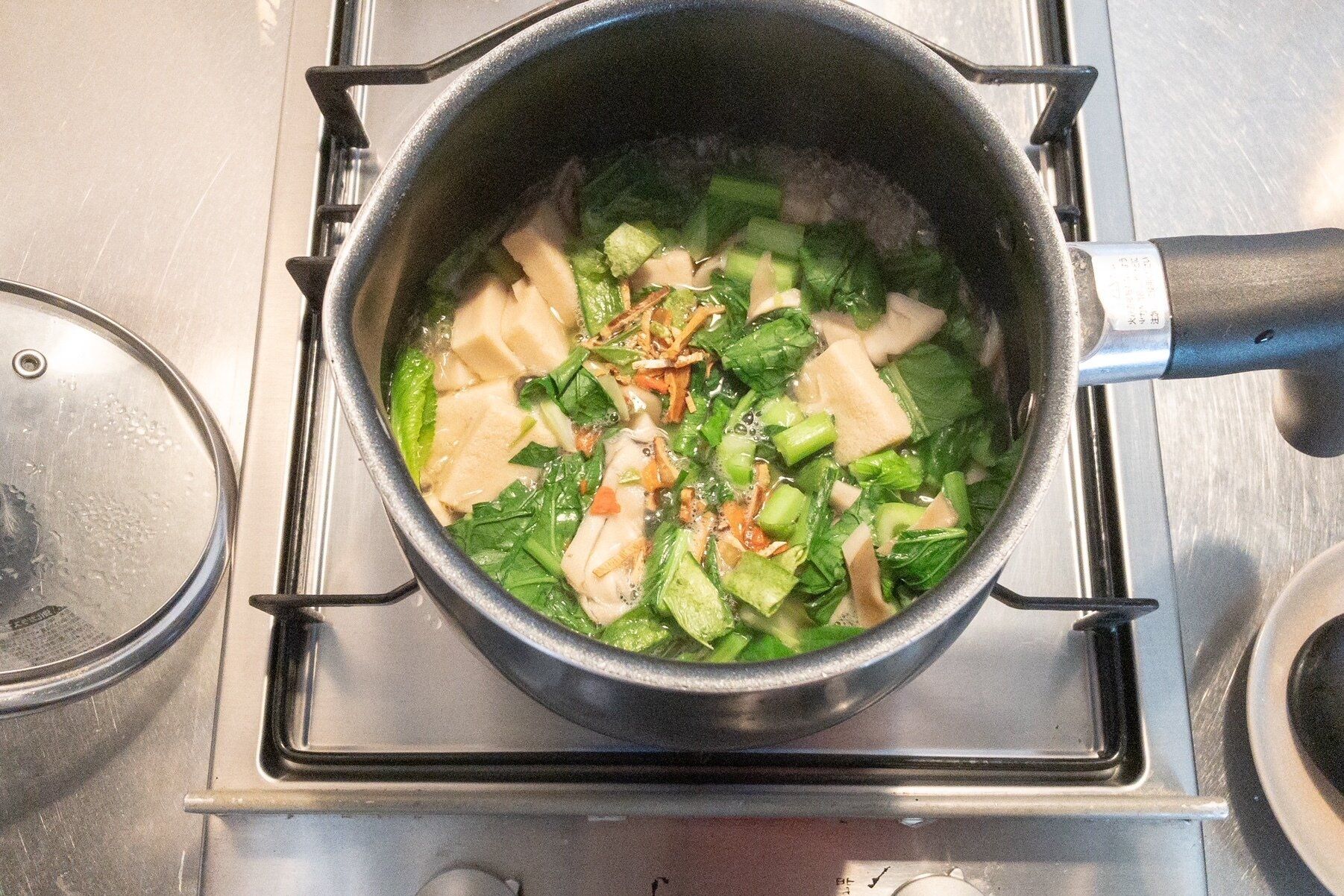 1、鍋にお湯と添付の粉末だしを入れ、煮汁を作り、沸騰させる