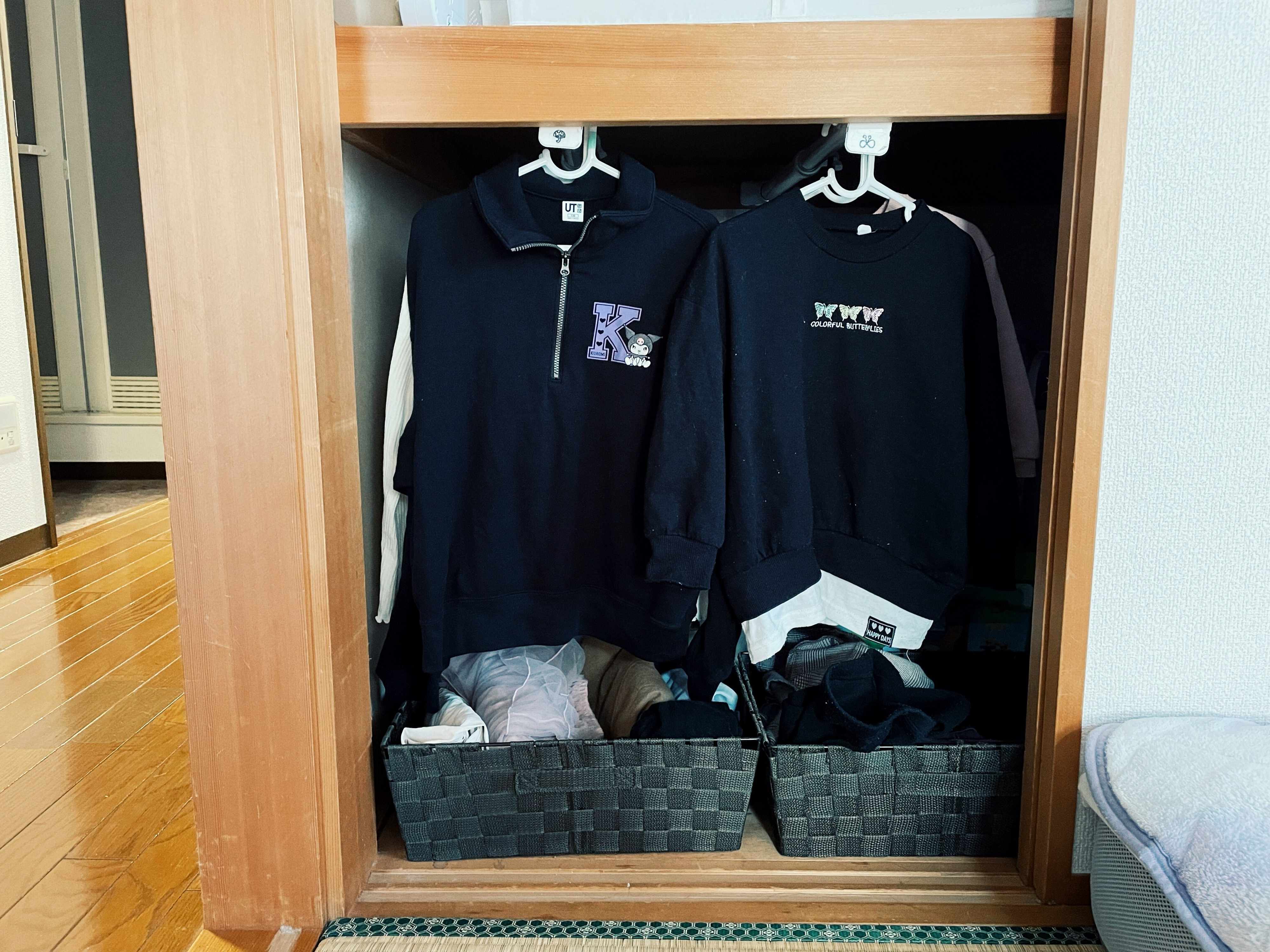 子どもが自分で服を選べるように、子ども服は押し入れ下段に収納。突っ張り棒を使えば、どこにでも「かける収納」が作れます。