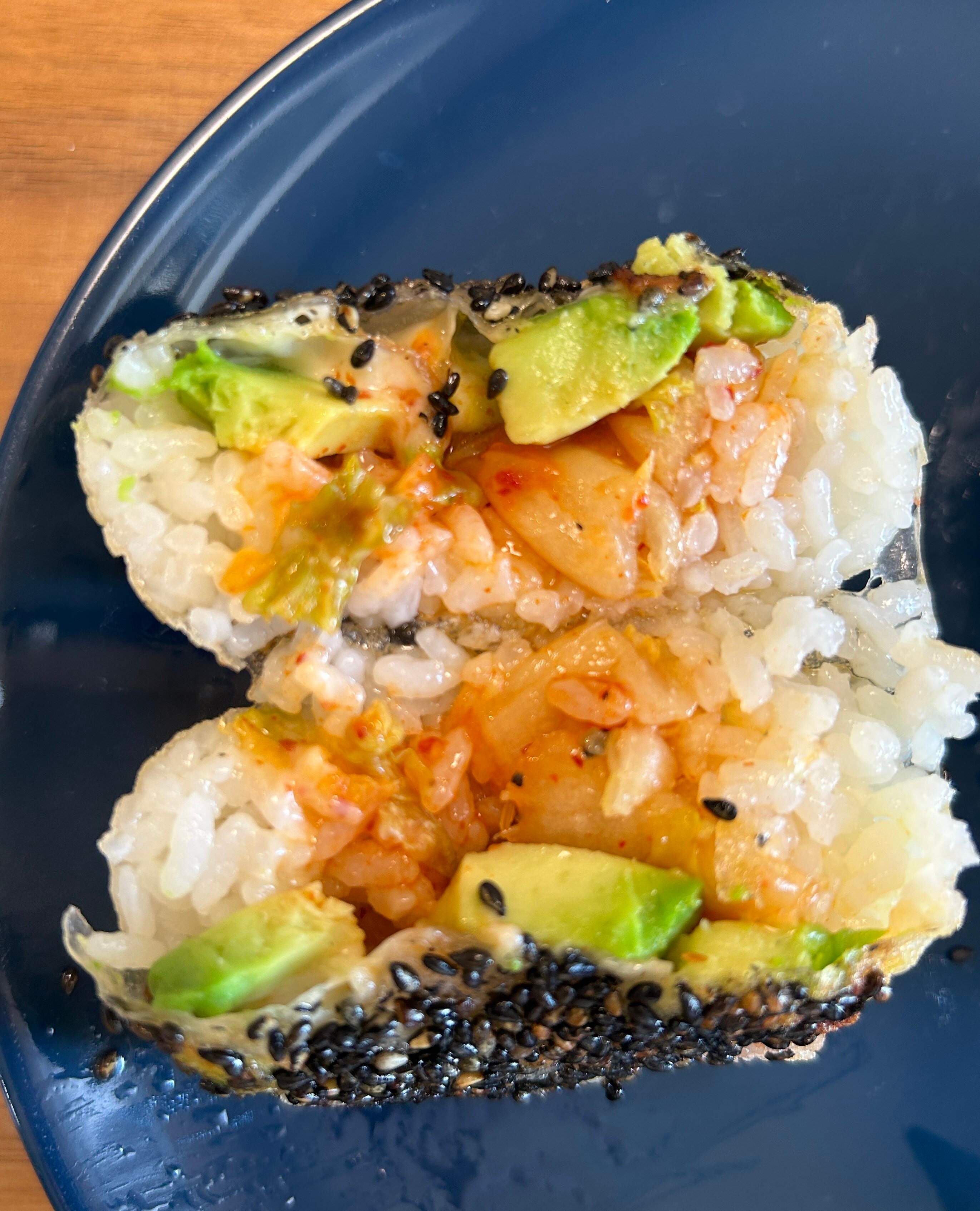 2. キムチ、スライスしたアボカド、ピザ用チーズを加え、ラップを使って包む。