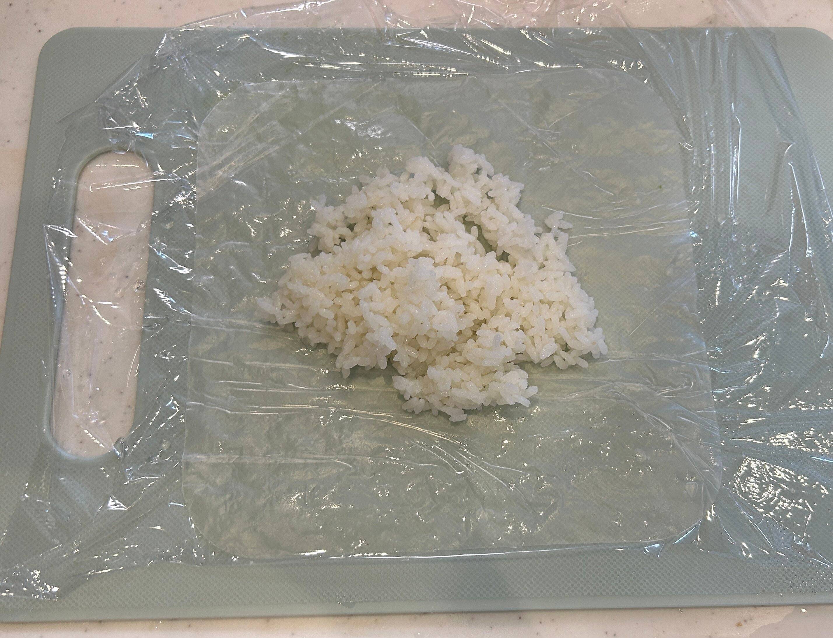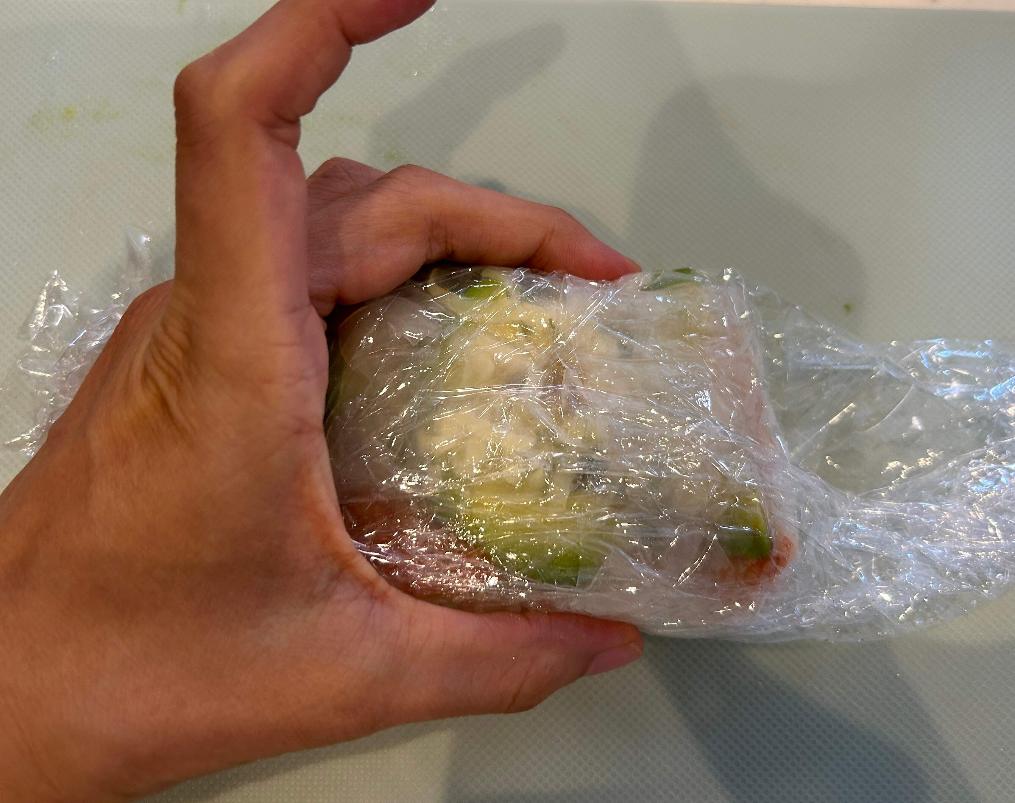 (ラップごと持ち上げて畳んで、具やお米にライスペーパーが馴染んだらラップをそっと剥がす)