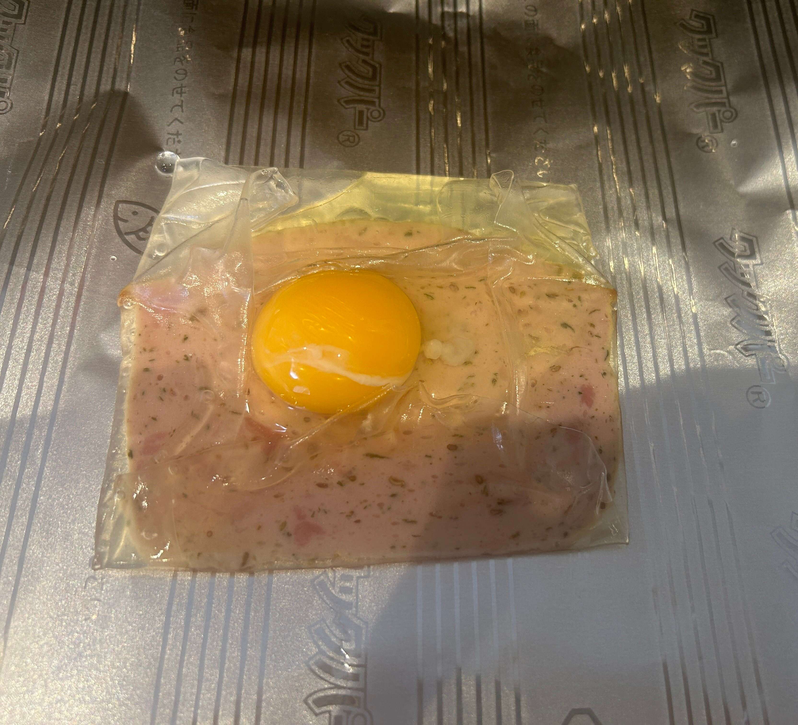 2. ライスペーパーが柔らかくなったらハムを乗せ、上から卵を割り落とす。