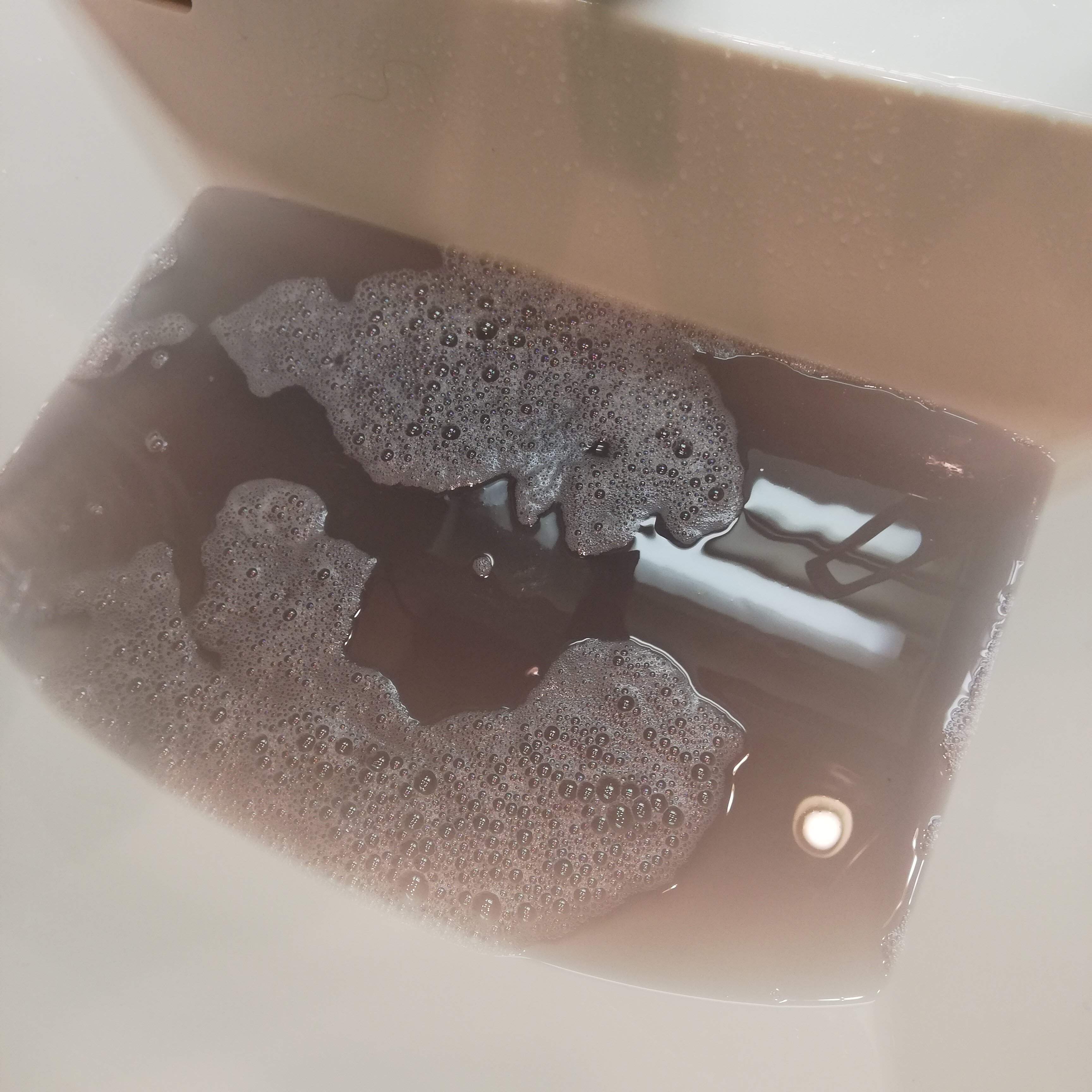 こすったりはせず、10分弱押し洗いした後の汚れ水です。