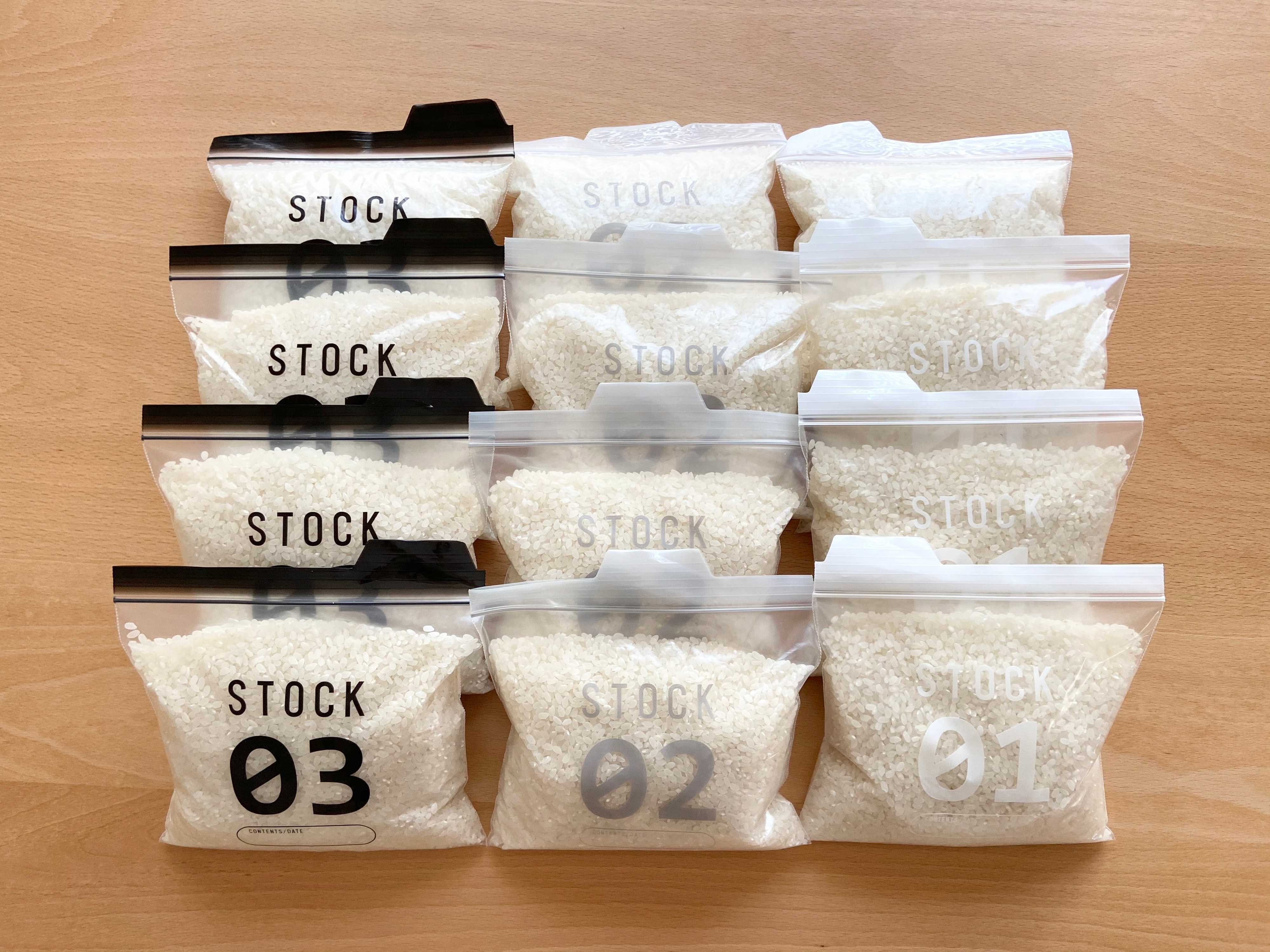 セリアのフリーザーバッグは番号が付いているので、分量を少し変えて番号で見分けられるようにしています。かつフリーザーバッグ収納だと省スペースで収納できるのが魅力的。フリーザーバッグ12袋でちょうどお米5kg分。これだと夕食何回分のお米があるのかが一目でわかるのでお買物の計画にも役立ってます。