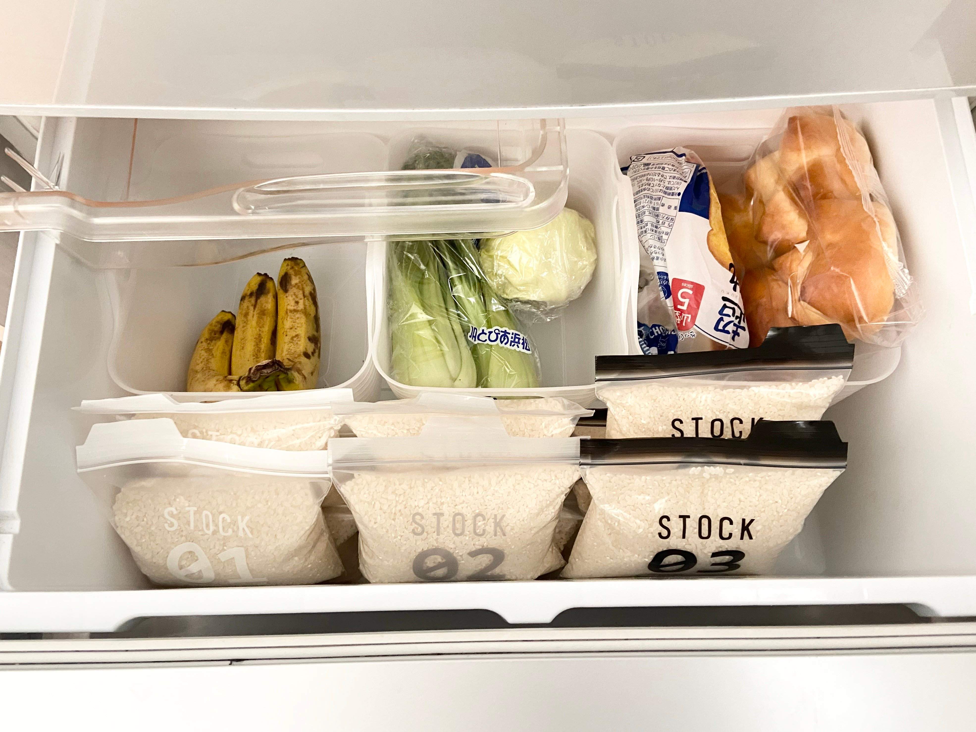 敢えてフリーザーバッグに入れ替えているのは残量を一目で把握するためです。冷蔵庫の管理を簡単にするには、目で見て何がどれだけあるのかすぐわかるというのが一番だと思っています。