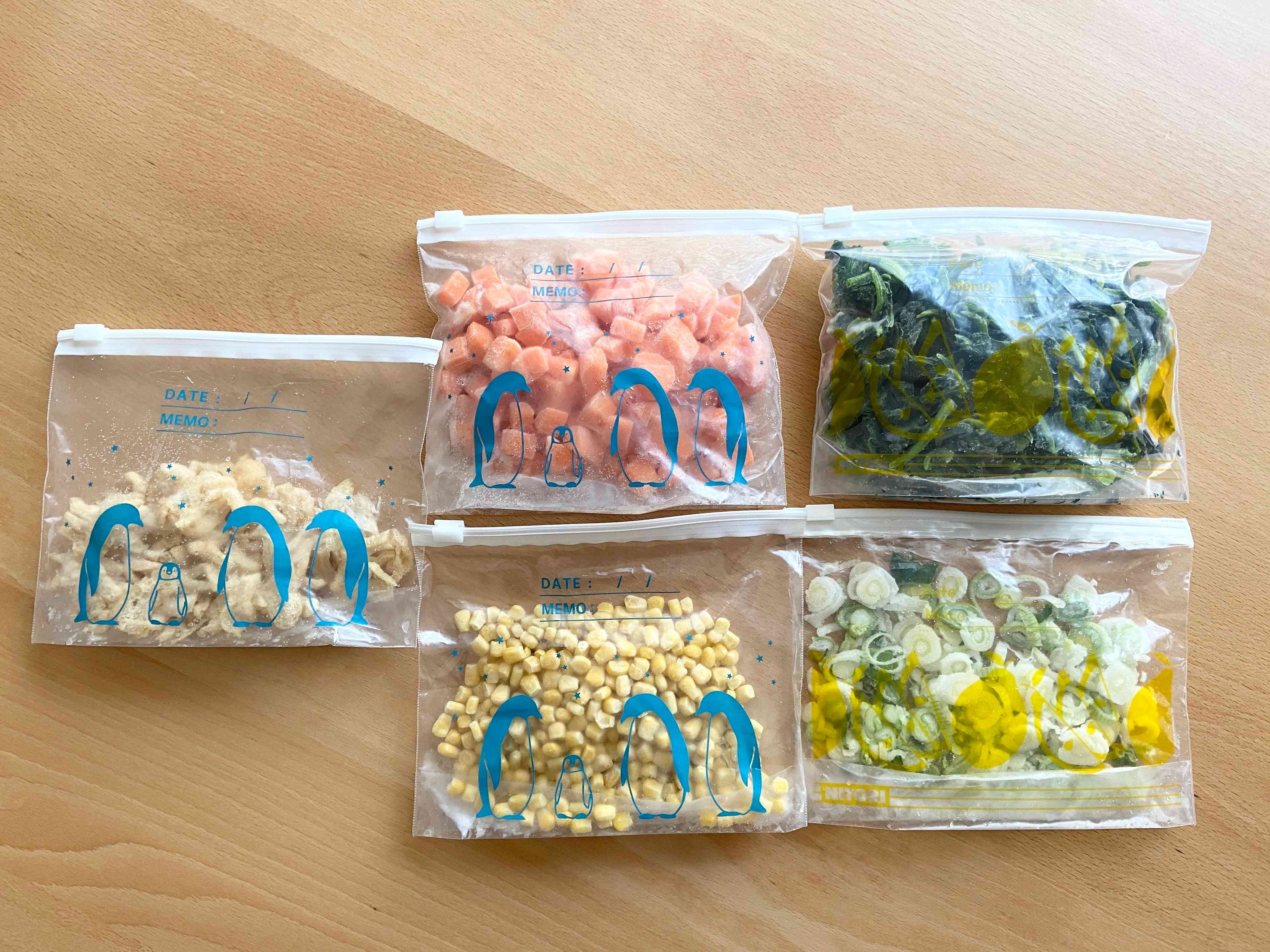 我が家の冷凍庫には、お揚げ、人参、ほうれん草、コーン、ねぎを常備しています。お揚げや、ほうれん草、コーンは最初から冷凍されたものを購入して、ねぎや人参は買ったらすぐにカットして、ニトリのマチ付のスライドジッパーフリーザーバッグに入れ替えています。常備菜作りは無理でしたが、入れ替えと少しばかりのカットくらいなら時間がかかりません。これだけのことですが、すぐに使える食材があるというのは心の余裕と食事作りの時短につながります。