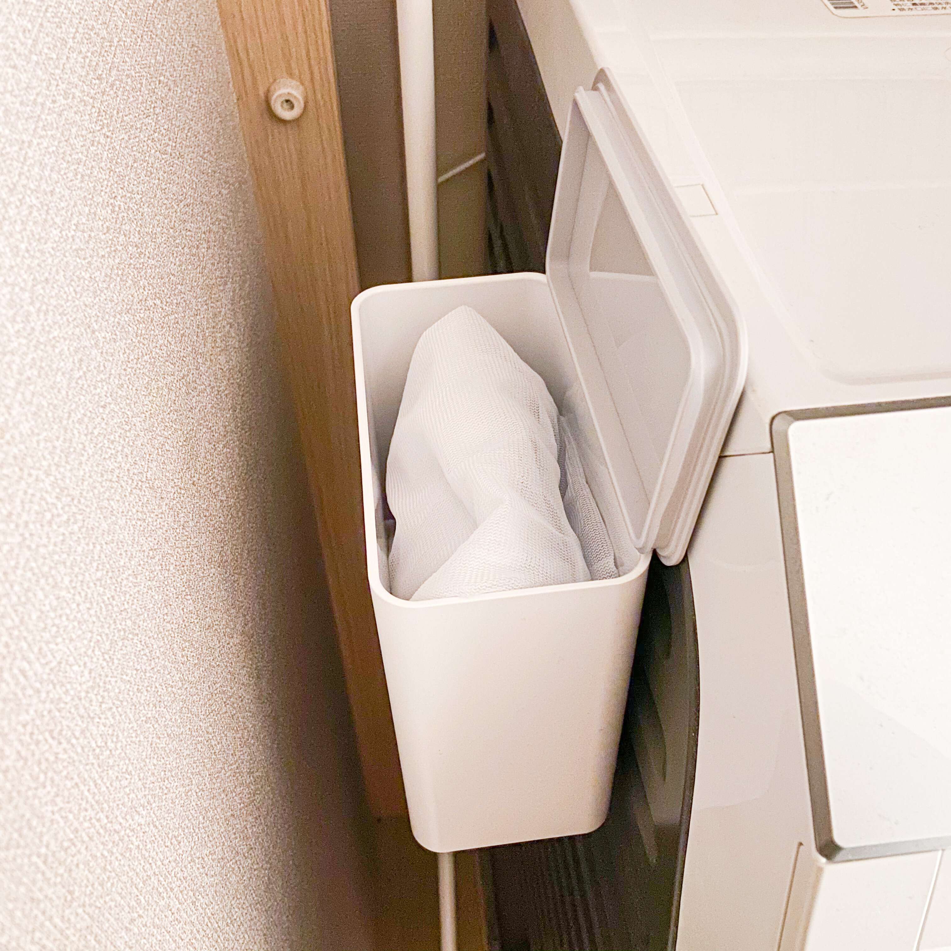 洗剤ボール用ですが、我が家では洗濯ネットを収納。片手で開け閉めできるので便利!洗濯バサミなどを収納しても良いかもしれませんね。