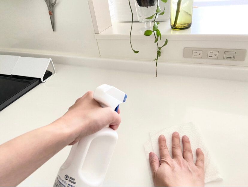 我が家の場合は毎朝全員が朝食を食べ終えた後、除菌も兼ねてパストリーゼでキッチンを拭きあげるようにしています。