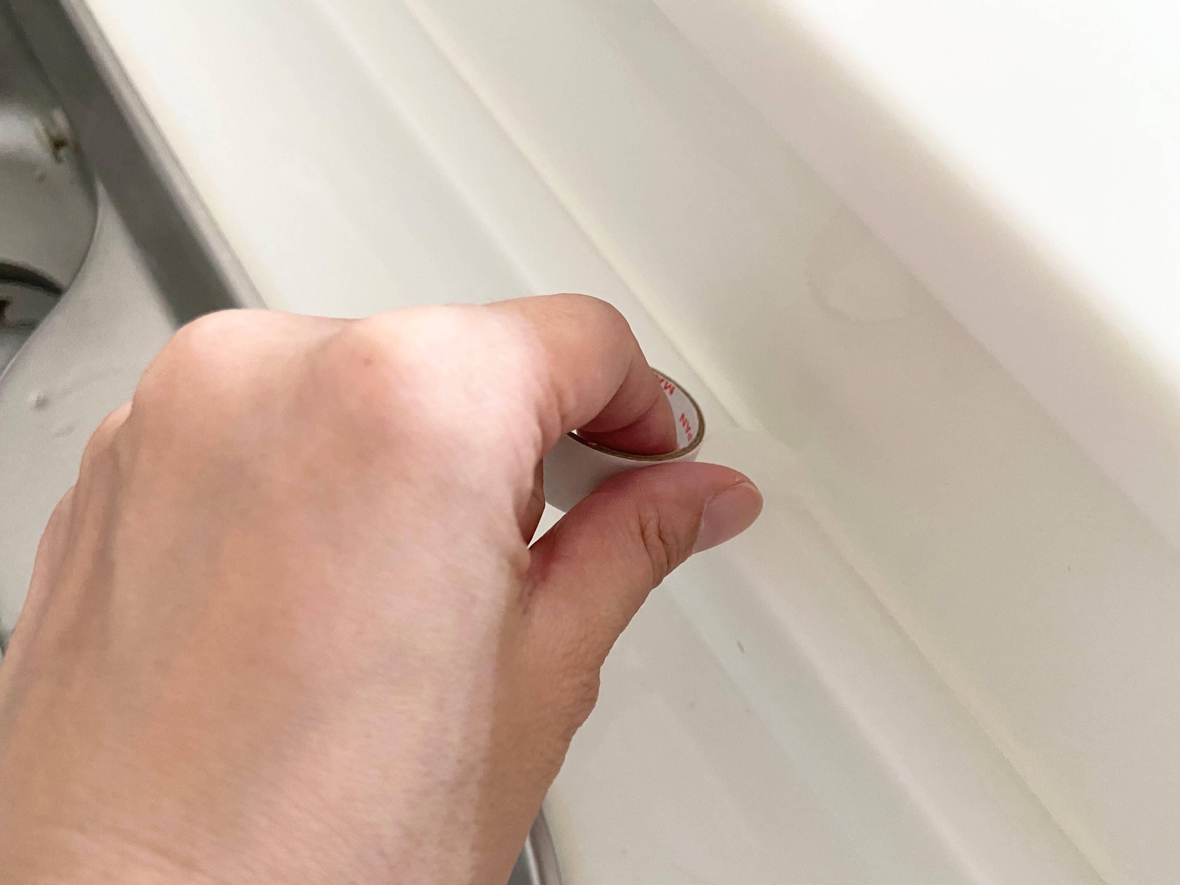 毎日綺麗に拭き掃除していても、少しずつ汚れていくのが調理台と壁のつなぎ目のコーキング部分。埃がコーキング部分に着くと汚れが取りづらいため、目地にマスキングテープを貼って予防しています。マスキングテープだとサッと拭けば汚れも取れ、汚くなれば貼り替えるだけですむため楽ちんです。