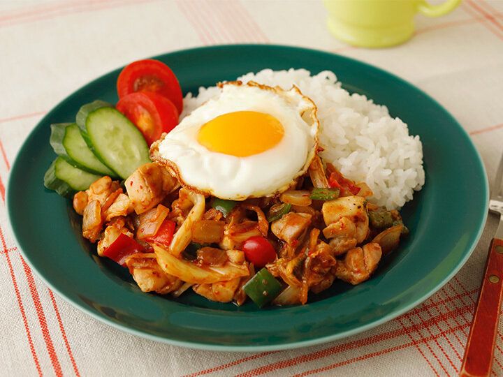 2.フライパンにサラダ油を熱し鶏もも肉と玉ねぎを入れて炒める。鶏肉の色が変わってきたらピーマンと「ご飯がススムキムチ」を加え、酒を回し入れて炒める。オイスターソースを加え、さっと炒めたら火を止める