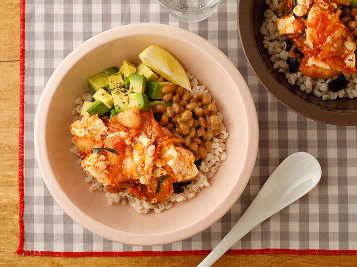 2.「ご飯がススムキムチ」と絹豆腐をボウルに合わせ、レモン汁小さじ2、塩少々、オリーブオイル小さじ1を加え豆腐を少しくずしながらざっと混ぜる