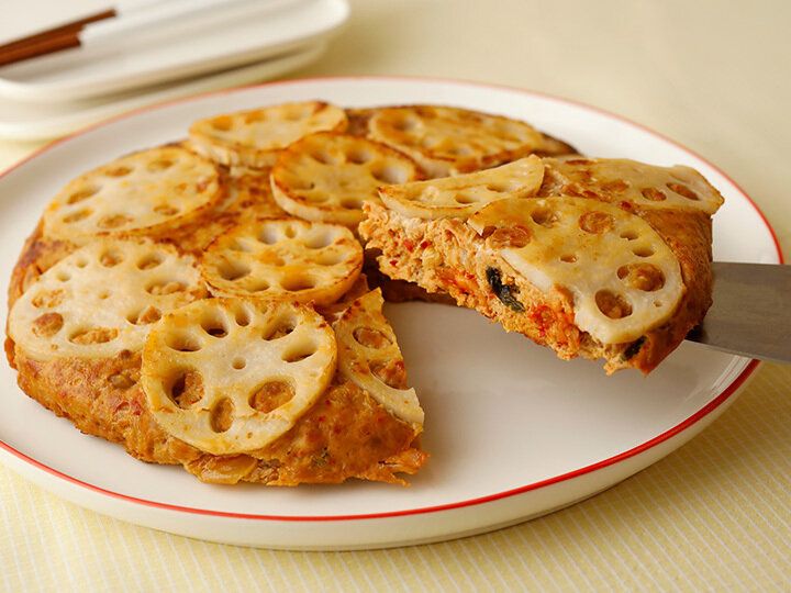 3.フライパンにサラダ油をしいてれんこんを並べる。その上に2をフライパンいっぱいに平たく広げる