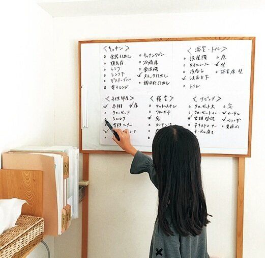 年末の2日間、家族総出で片づけ、掃除をするのが年中行事。ボードに各自の担当個所を書き出し、合宿のようにみんなで盛り上がってやるとあっという間にスッキリ!