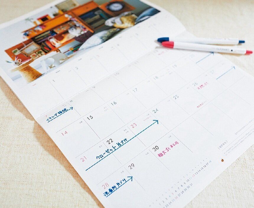 年末までにやっておきたい片づけの予定を、カレンダーや手帳に記入。”見える化”することで、やる気も高まります。粗大ゴミや不燃ゴミを出す日もしっかり明記!