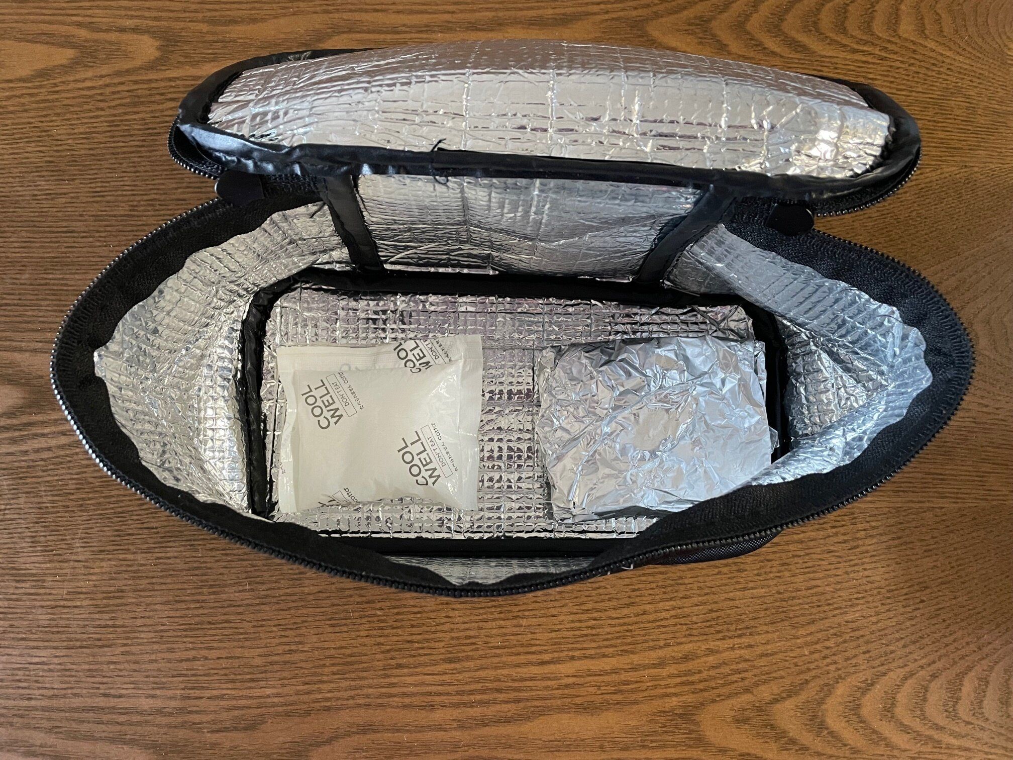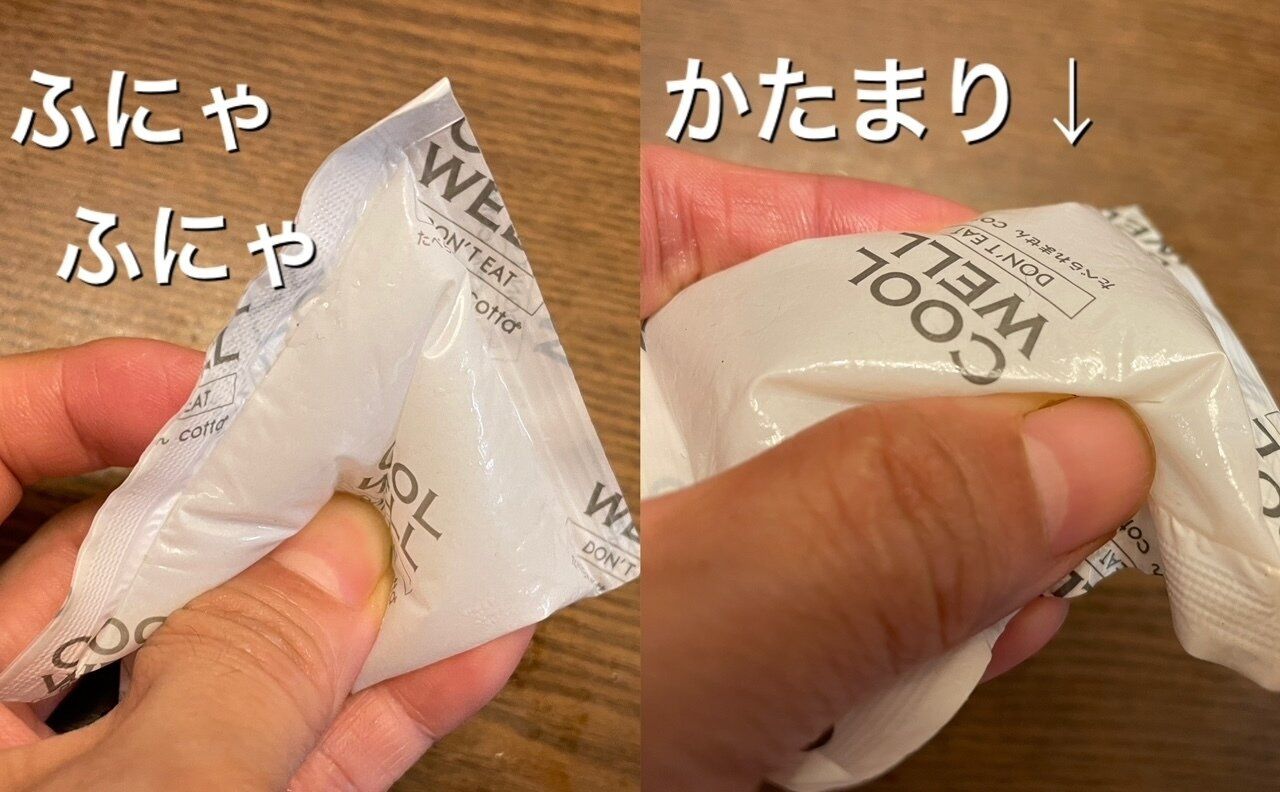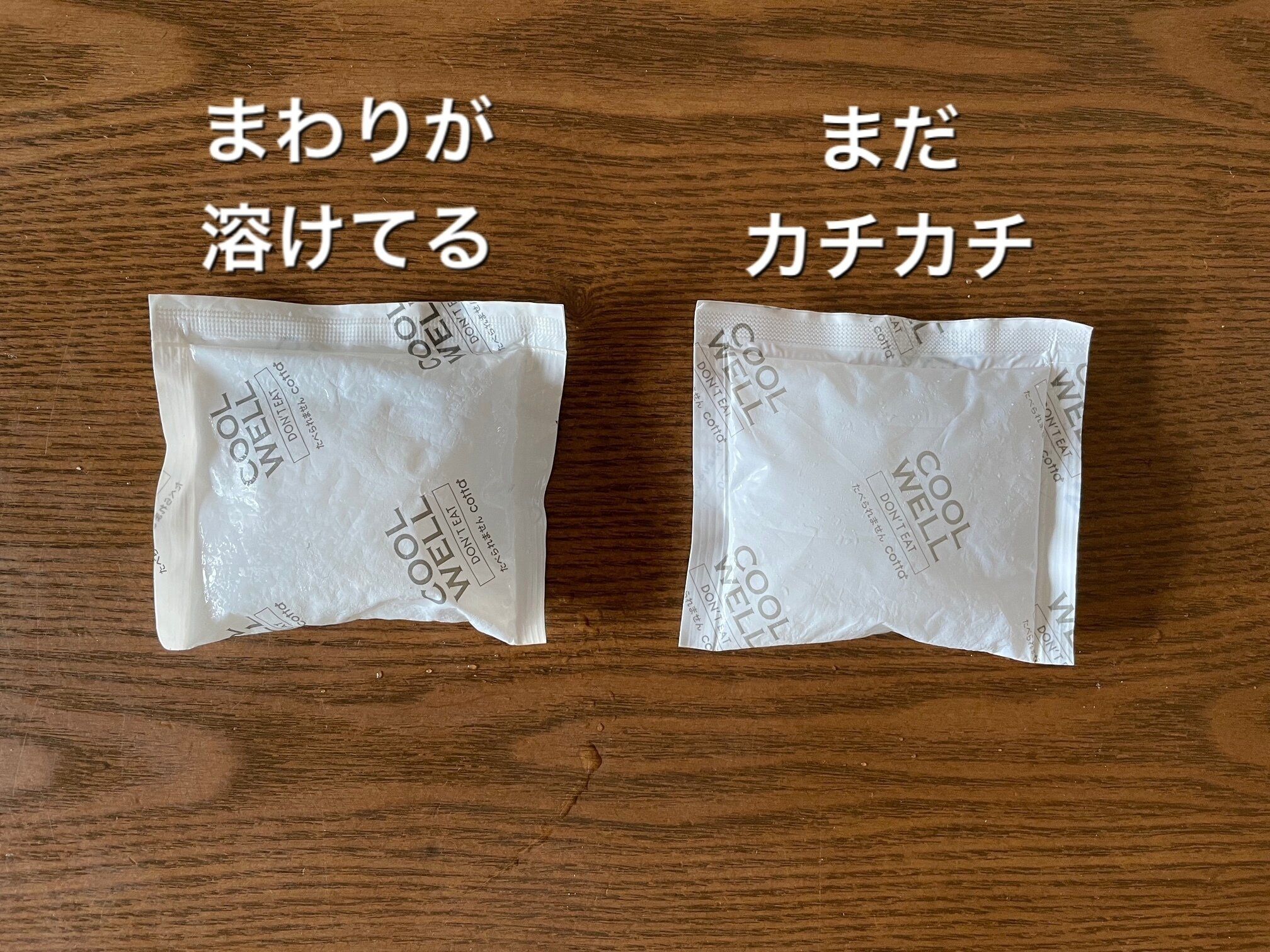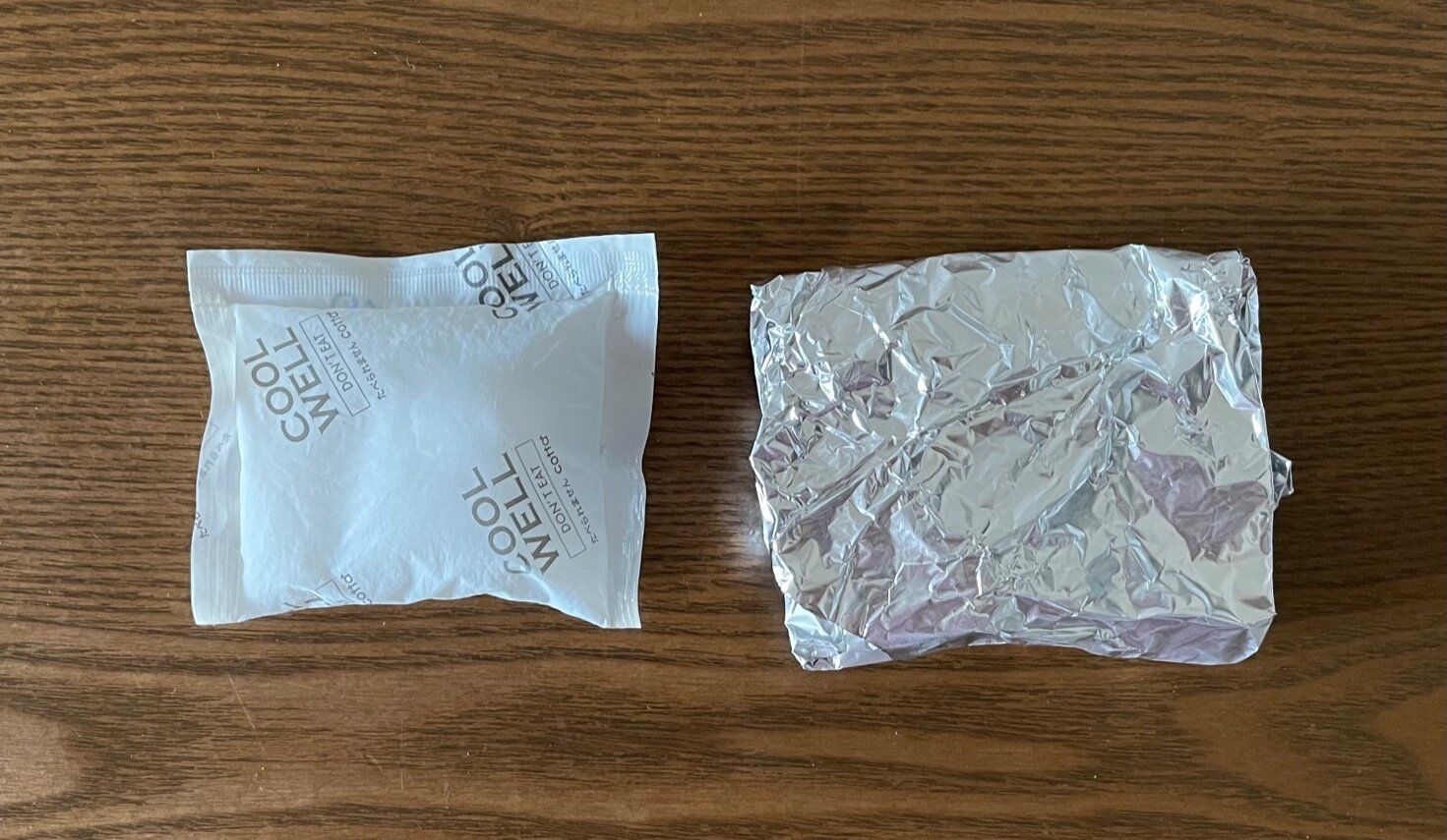 いったいどのくらいの違いがあるのでしょう?6cm×6.5cmの小さめな保冷剤を使って実験してみました。ケーキを買うと付いてくるくらいのサイズですね。一方はそのまま、一方はアルミホイルで巻いて、お弁当用の保冷バックに入れて部屋に放置してみます。