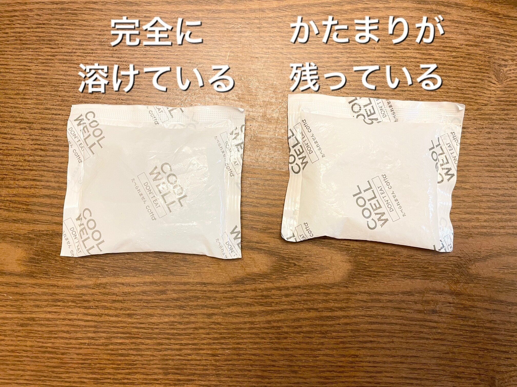 そのままのものは完全に溶けきっているのに対し、アルミホイルで巻いたものは、まだ固いところが3cm四方ほどは残っています!やはりアルミホイルを巻いた方が保冷剤が長持ちすることがわかりましたね。