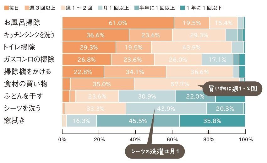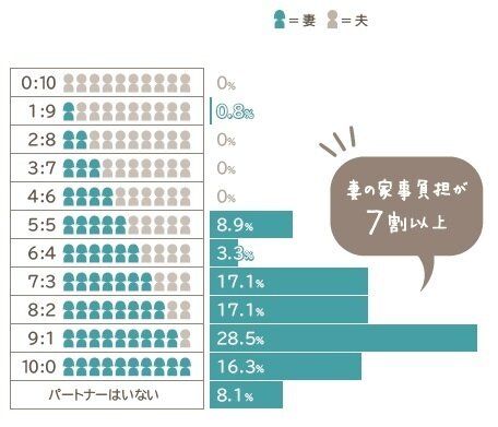 まだまだパートナーと均等になっていない、日本の家事シェア事情が浮き彫りに。79%の家庭で、妻の家事負担率が7割を超えています。