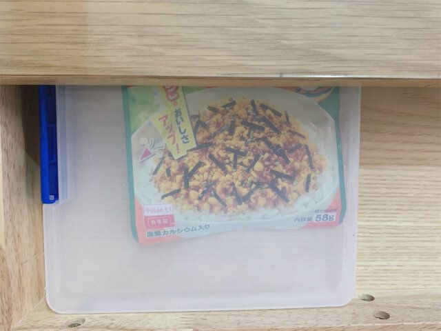 100均の書類ケースにふりかけを入れて、引き出しに収納しています。