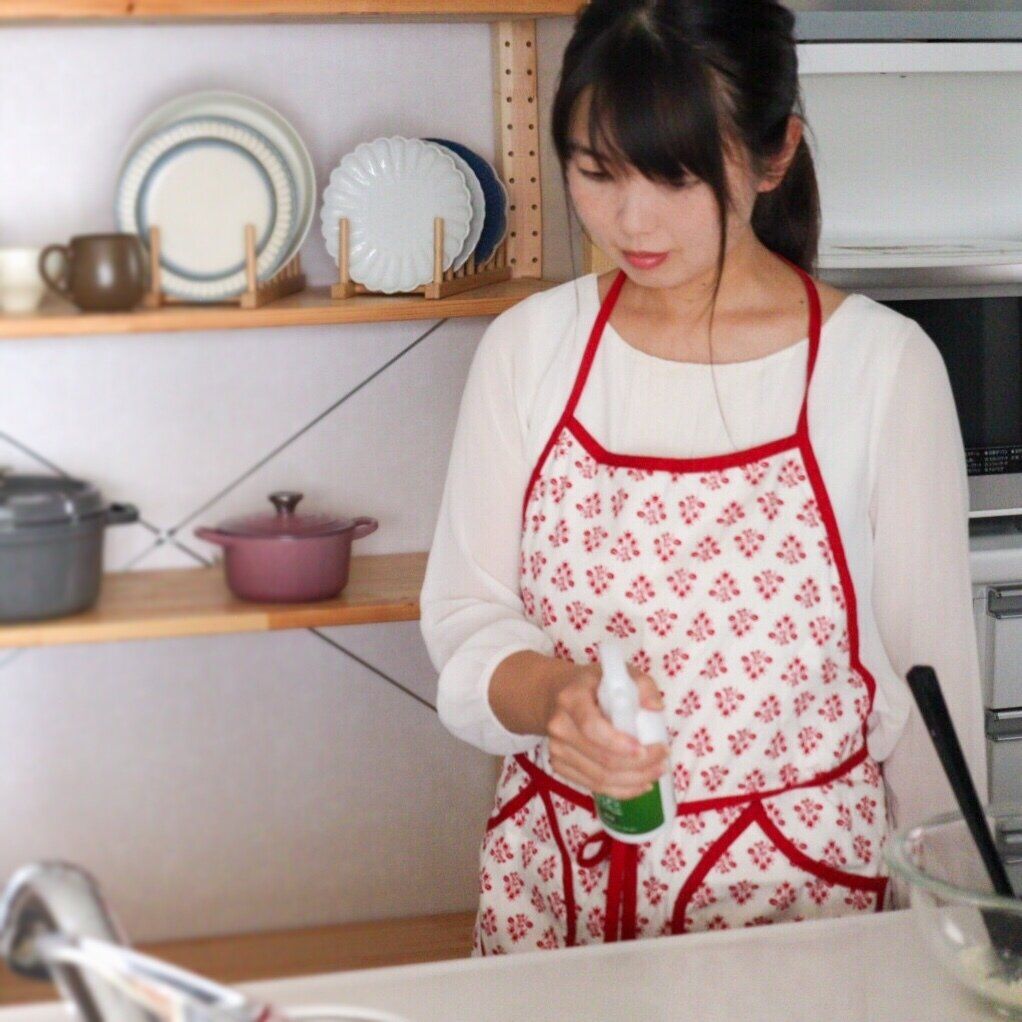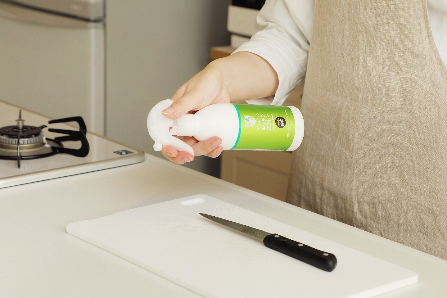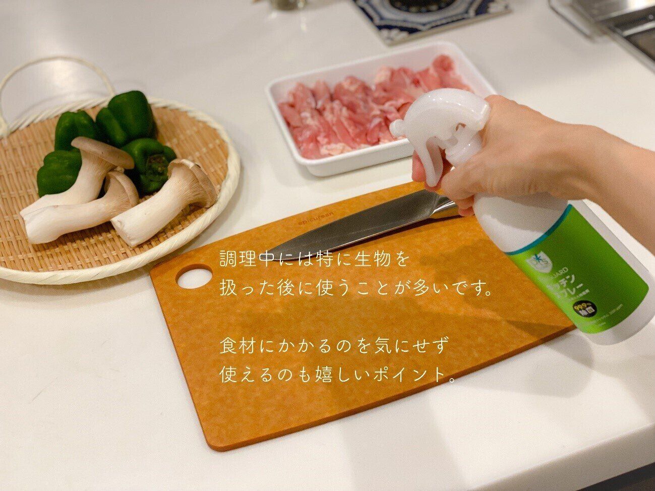 限られたスペースのキッチンでは、キッチンスプレーで除菌する際に、近くに置いてある食材にかかってしまうことも。それを気にせずスプレーできるので、お肉やお魚などの生ものを使った直後や、生のままいただく食材を調理する前など、キッチン台や調理器具などをスプレーするのにとても使いやすいと感じています。