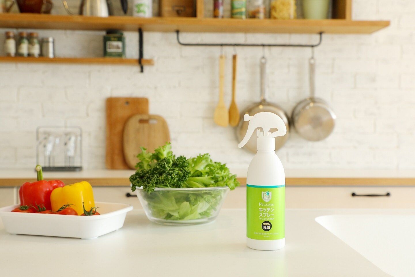 長年にわたり飲食店やホテル、食品工場などのプロの現場で愛用されてきたという「P’s GUARDブランドのキッチンスプレー」は、食材に直接かけることもでき、ノンアルコールで洗い流さず使えるうえに、99.9%速攻除菌※なので、まさに料理を作る前や調理中の除菌にぴったり!