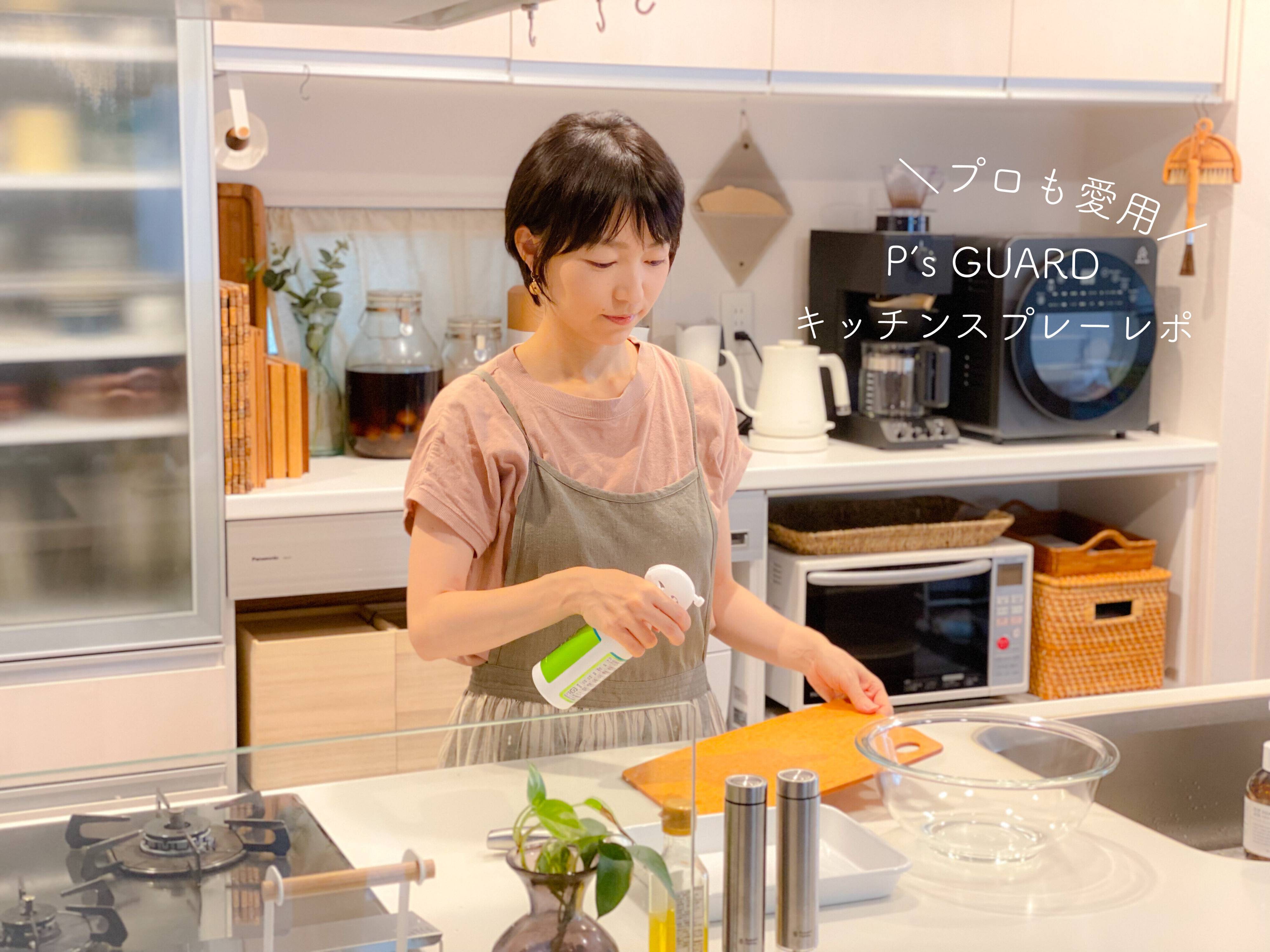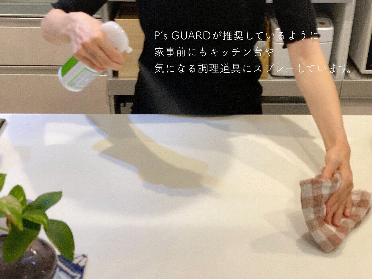 「P’s GUARDキッチンスプレー」は、アルコール除菌では除菌しにくいウイルス・菌を除去するために使えるので、アルコールと併用して使っています。さらに、「P’s GUARDキッチンスプレー」はノンアルコール。においも気にならず、肌についても負担や刺激が少ないのが特徴です。キッチン周り、調理器具、食器、食材などにシュッとスプレー♪ 洗わずにそのまま使えるのも便利です!