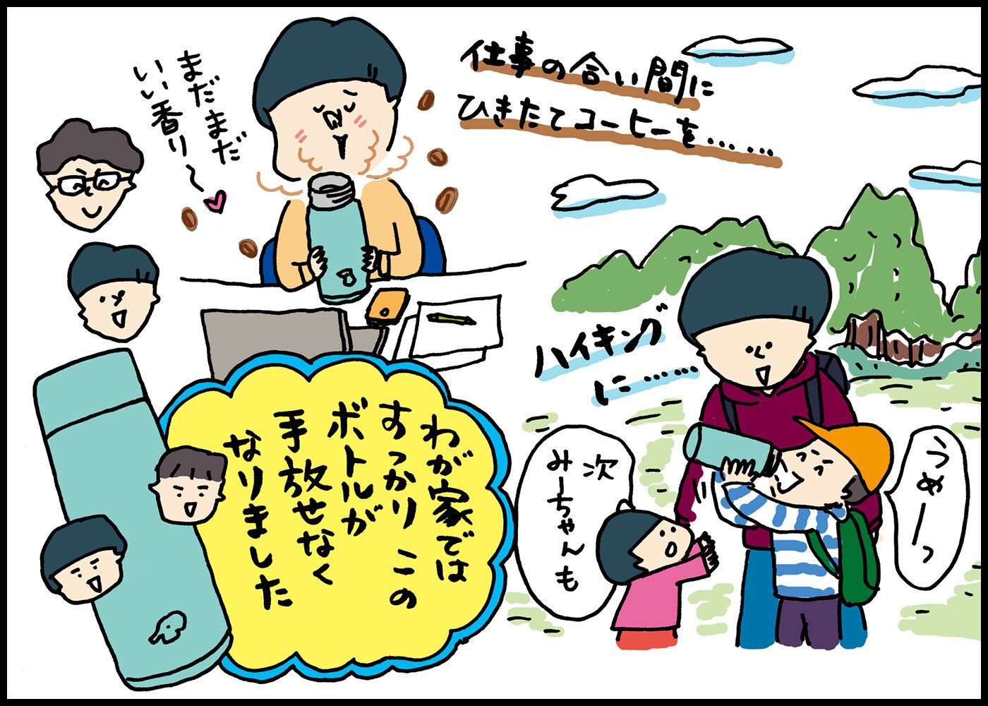 えのきのこさんファミリーの趣味はアウトドア。「このマイボトルで、おいしいコーヒーを飲みたいです」と言っていました。