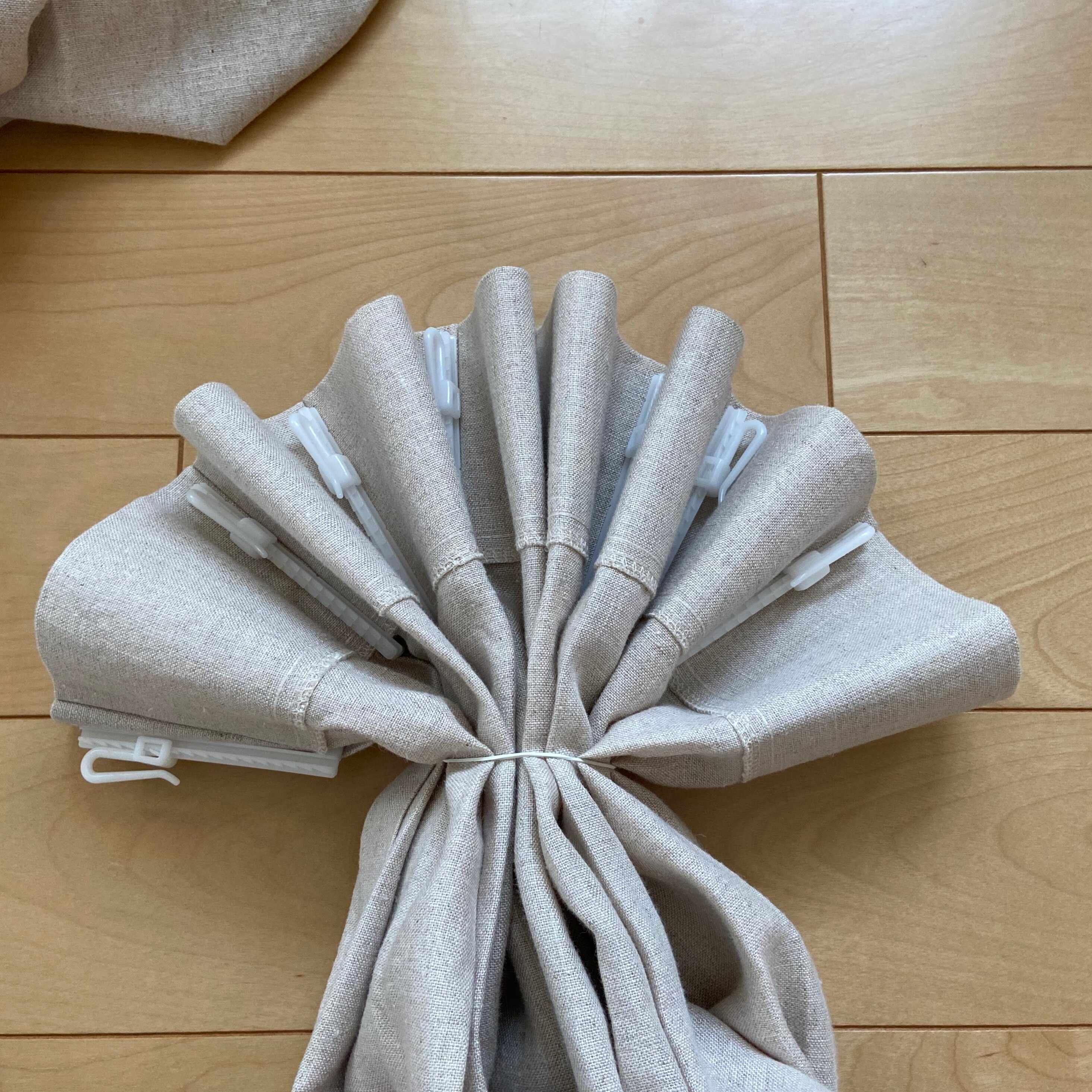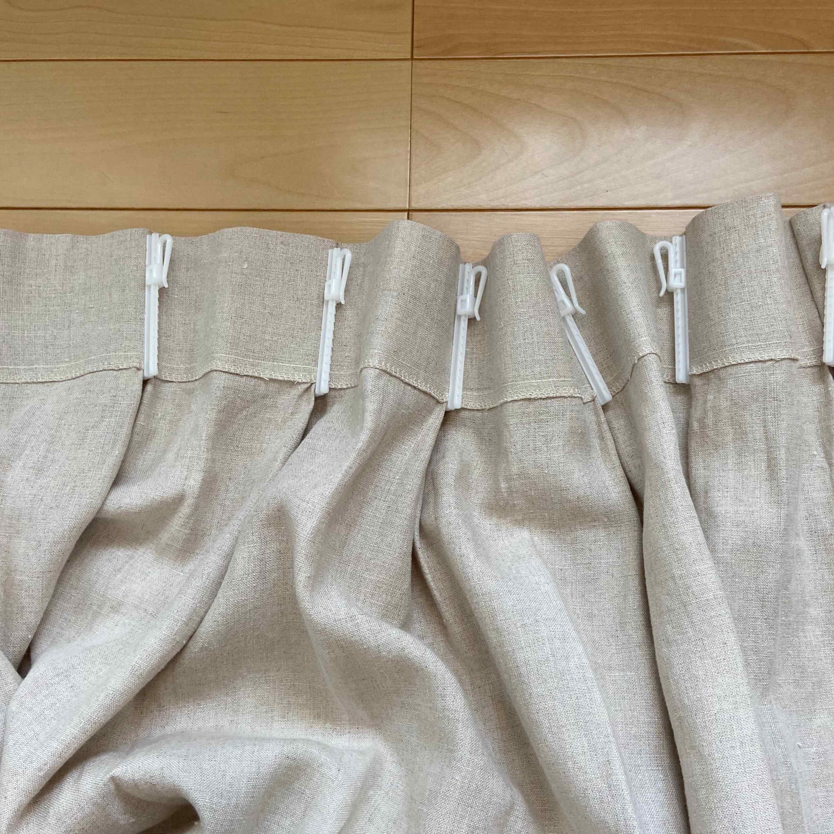 そして、こんな風にフックの下の部分をまとめて留めます。このときにカーテンのヒダがくずれないようにするとシワになりにくいです。
