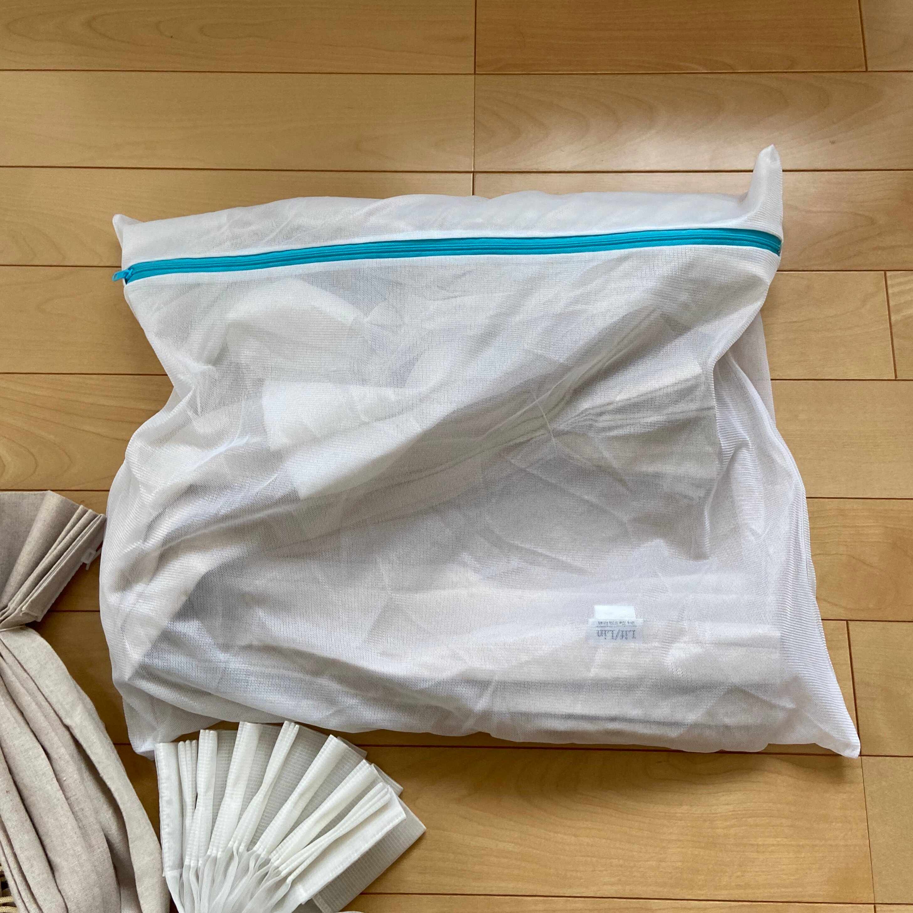 生地が傷つかないように洗濯ネットに入れます。ネットの中でギュウギュウ詰めにならないよう、なるべく大きなネットがオススメです。