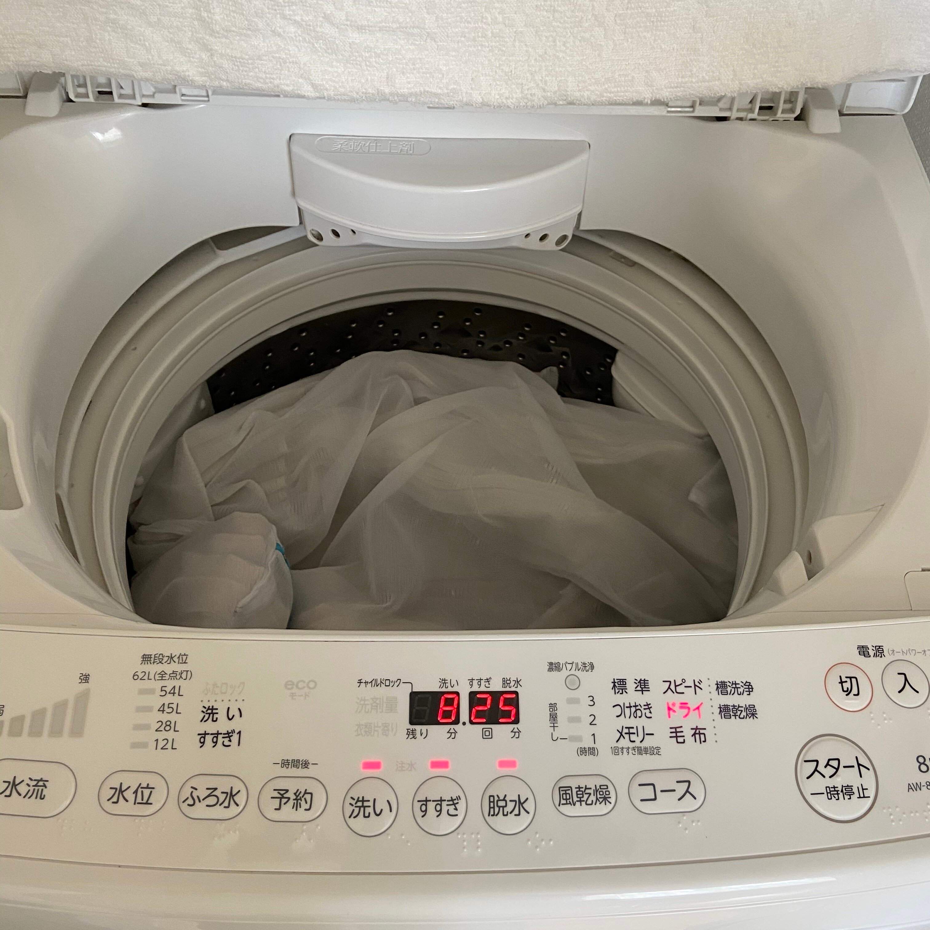 ドライコースは優しく洗うコースなので、水流や回転が通常運転とは異なります。カーテンを畳んだまま洗濯してしまうと、畳んだ内側だけ洗えてない⁉ということもあります。(ところどころ濡れてなかったり…)この洗濯法だとその心配もありません。