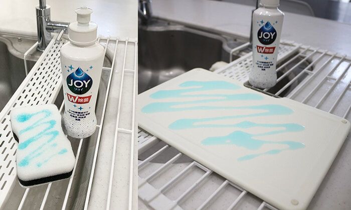 「スポンジの菌対策って、どうすればいいかわからなくて…気になりつつもそのままだったんですよね。それが『除菌ジョイ』なら、お皿洗いのあとにスポンジにまんべんなくつけて、クシュクシュもみこむだけ。次に使うときまでそのまま置いておけばOKなんて!※4 ついでのひと手間で簡単すぎて、感動です! しかもまな板の除菌もできる※5とか、ありがたすぎます!
