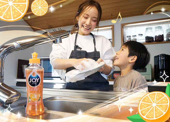 みずみずしいオレンジの香りにこだわった「香りジョイ」なら、食器洗いの時間も気分があがります。もちろん優れた洗浄力で頑固な油汚れも素早くすっきり落として時短にも!