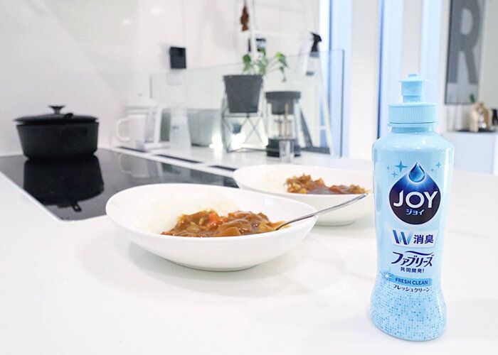 ファブリーズとの共同開発で誕生した「消臭ジョイ」。一度洗っただけでは残りがちだった気になるニオイも、油汚れと一緒に一度でスッキリ洗えるから、ニオイの強い料理を作ったときに頼れるそう!