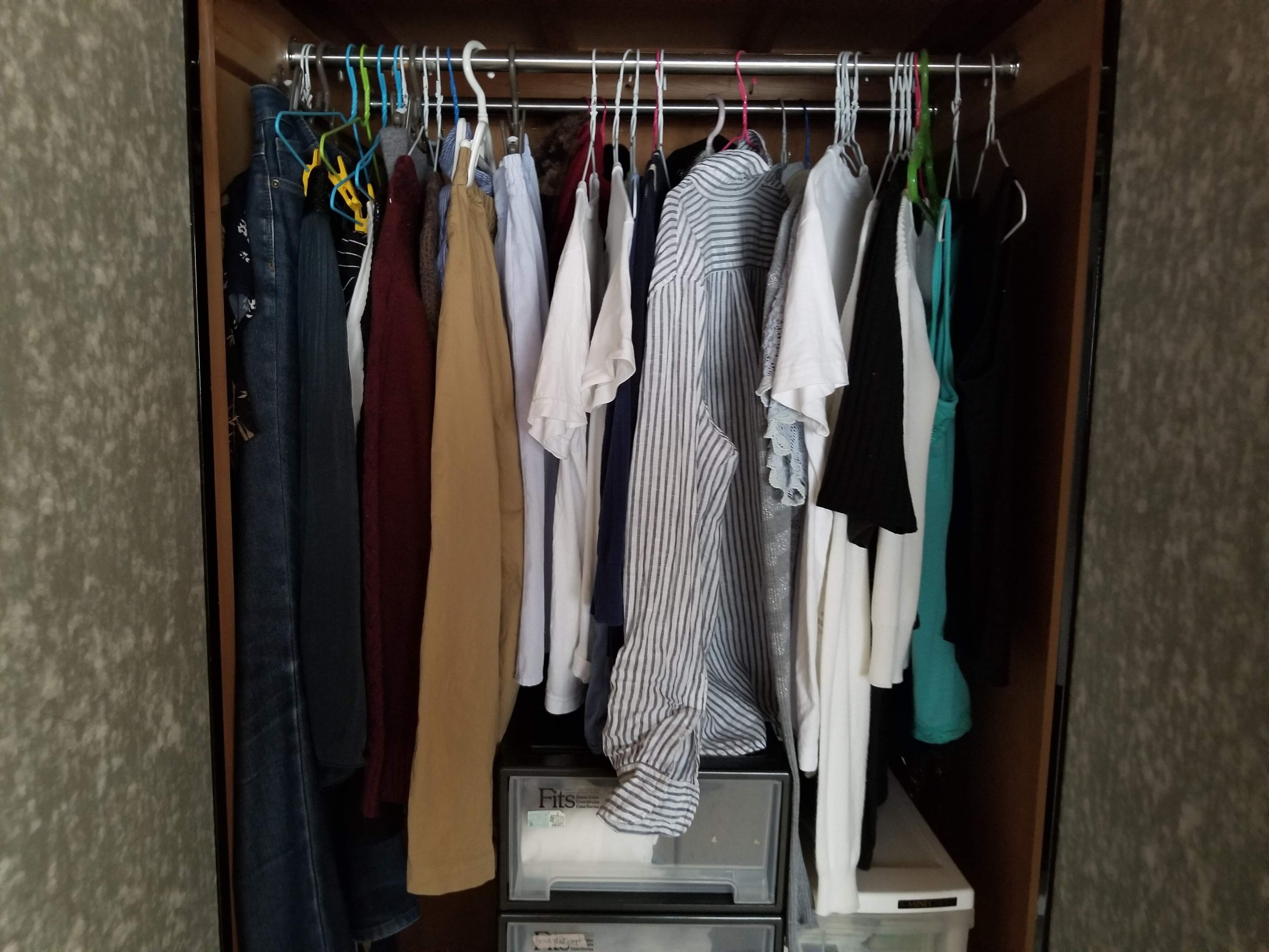 アイロンをかけないので仕事用以外の服は全部ハンガーにかけて干し、そのまましまっています。すぐ見渡せますので持っている服も把握しやすいです。