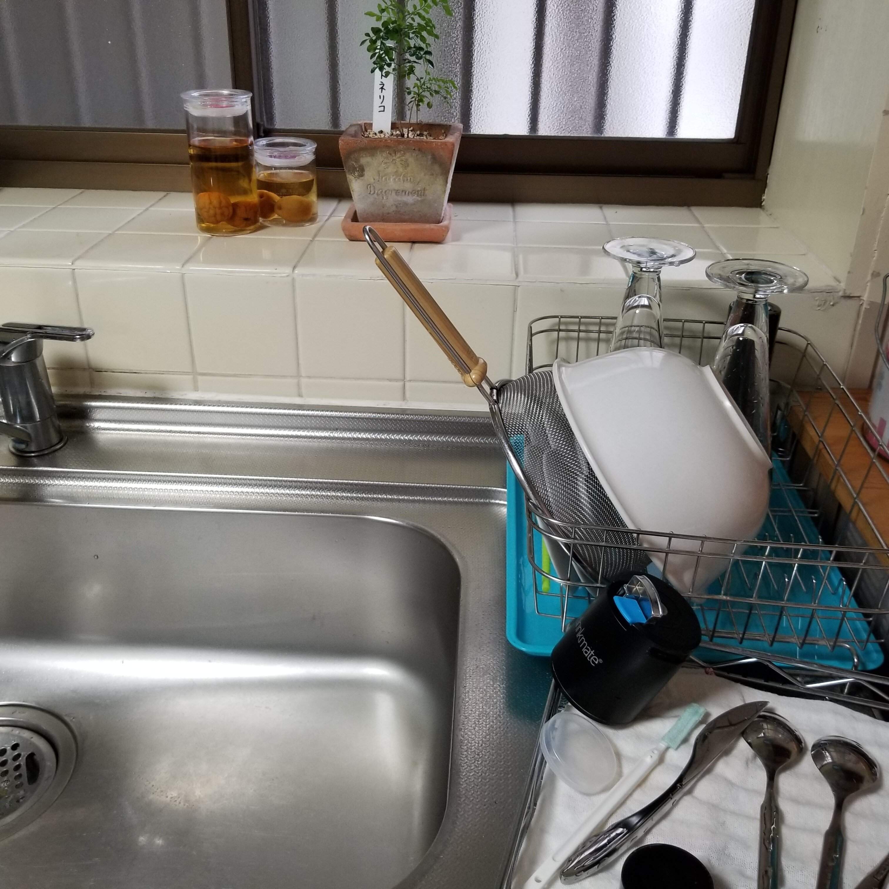 ところが拭くのがだんだん面倒になり、食器を布巾の上に並べるのも不安定でまた洗いカゴに戻しました。拭くのをやめてそのまま乾かすようになり、拭く時間も拭いたタオルを洗う時間も無くなってとっても楽です。
