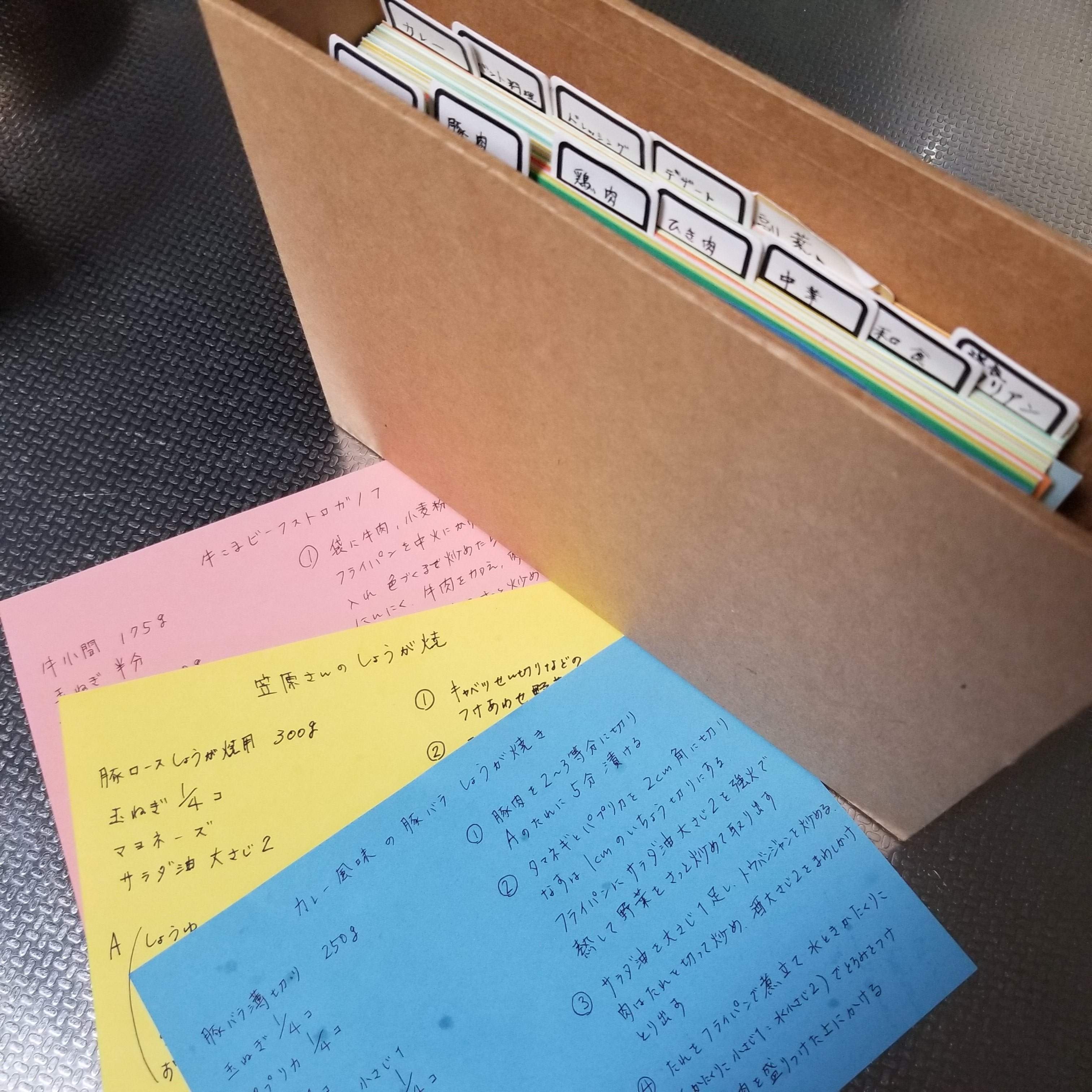 そこで私は、作ってみたいレシピがこれからも食べたいと思ったら、ダイソーで売っているB6サイズの画用紙に書いて、食材またはジャンル別に分けてすぐ取り出しやすいように、これまたダイソーのケースに入れてしまいます。