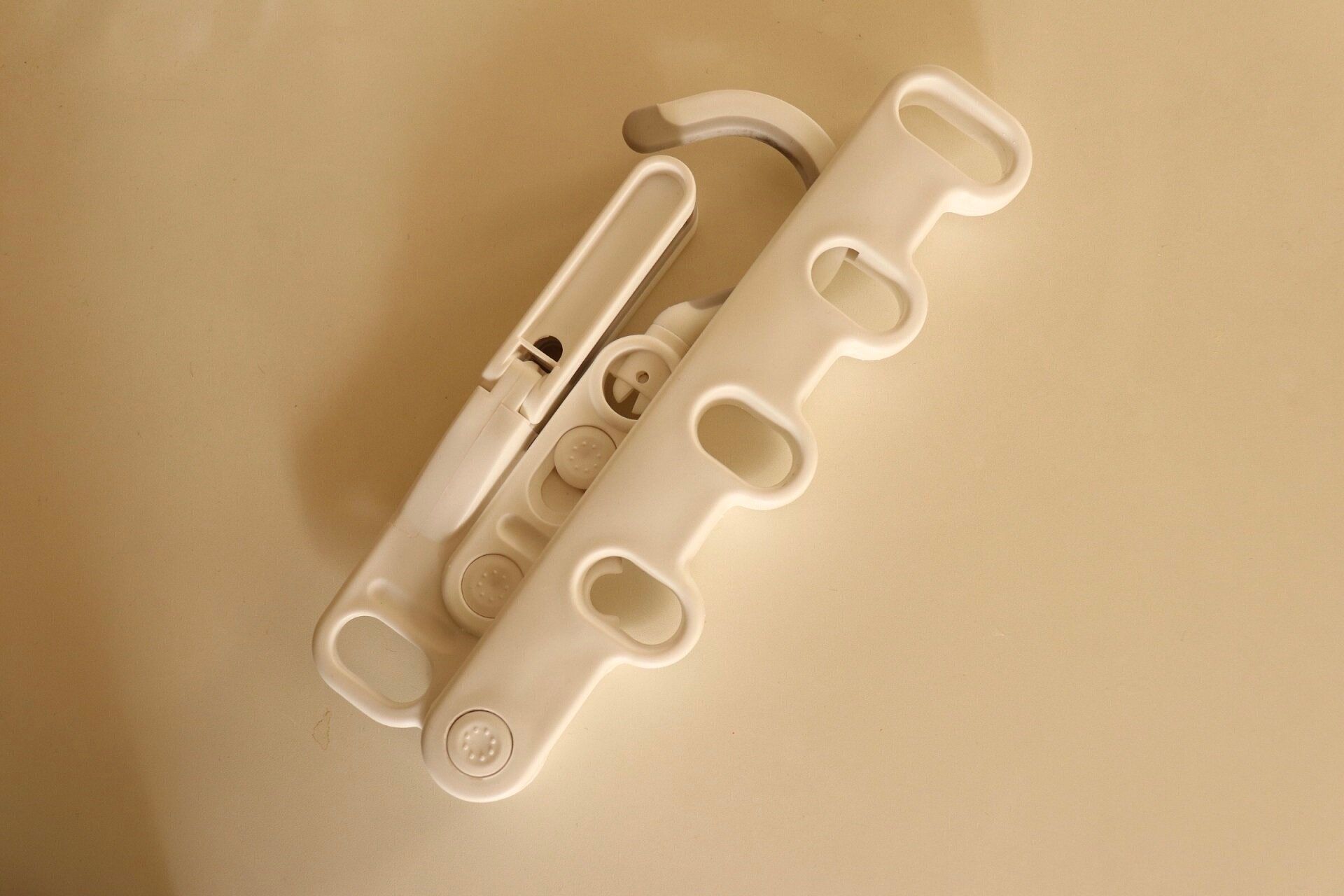コンパクトに折りたたまれたハンガーを広げるとフックの部分が2段階調整できるように。