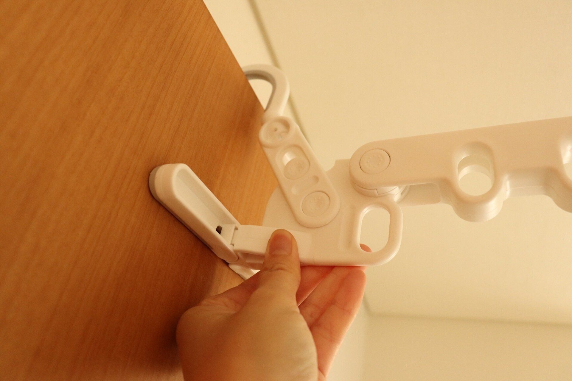 広げた後は引っ掛けたいところにかけるだけ!厚みは38mmまで引っ掛けられます。引っかける部分にも扉や家具などを傷つけにくい加工がされていて気遣いを感じる商品!