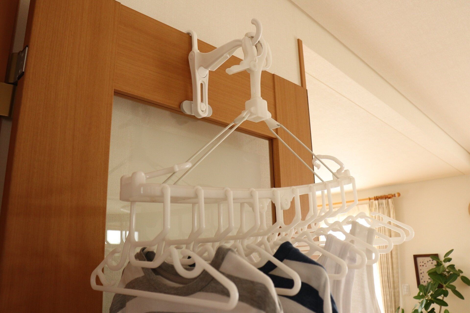 写真のとおり、扉に洗濯物を干す場所ができました。これは干すところが少ない室内干しの時、本当に便利!