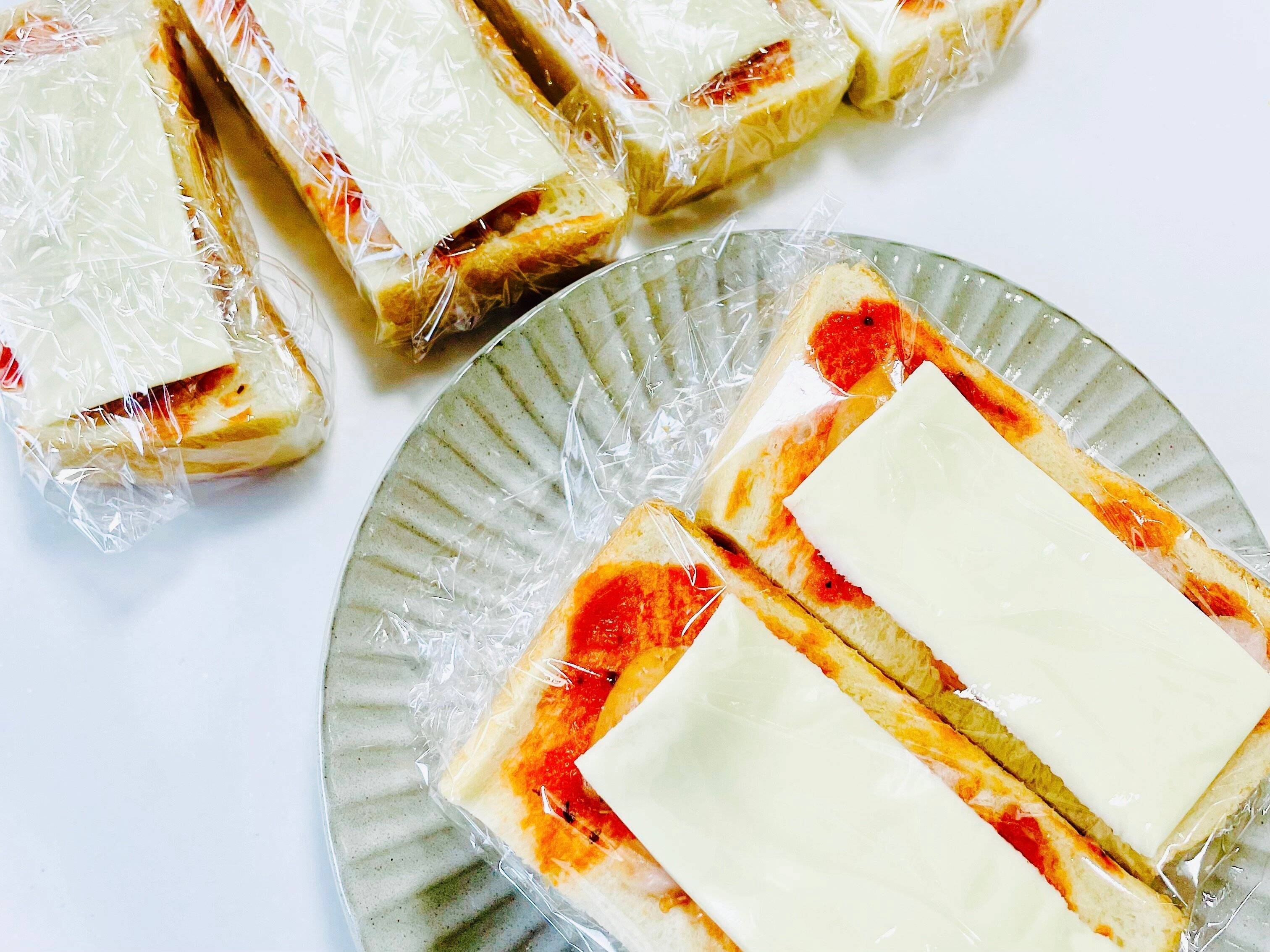 時間のある時に、ピザトーストをまとめてつくって、冷凍しておきます。残ったポテトサラダやカレーをのせても美味しいですよ。