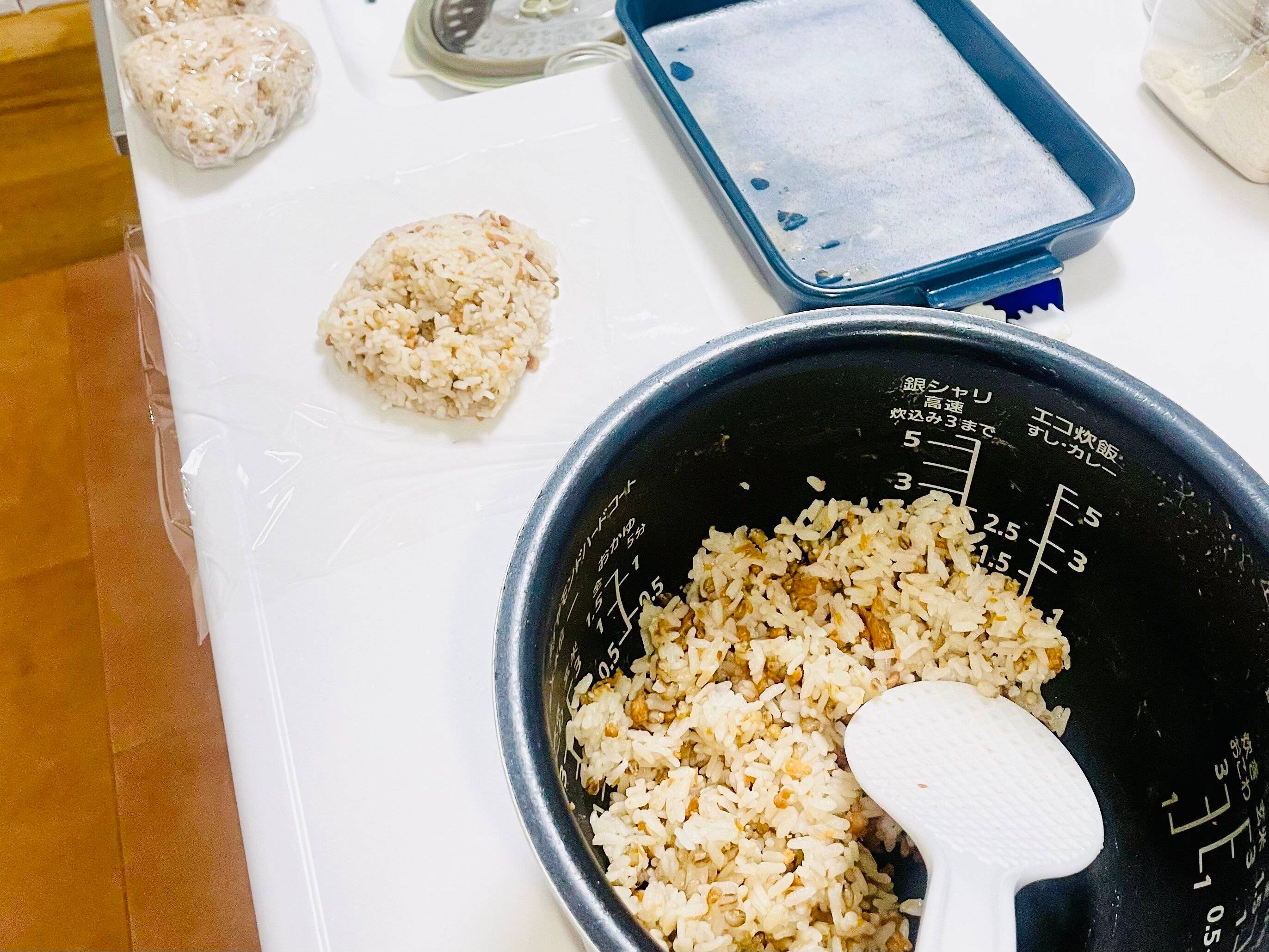 前日の夜、ご飯を多めに炊いておにぎりに。