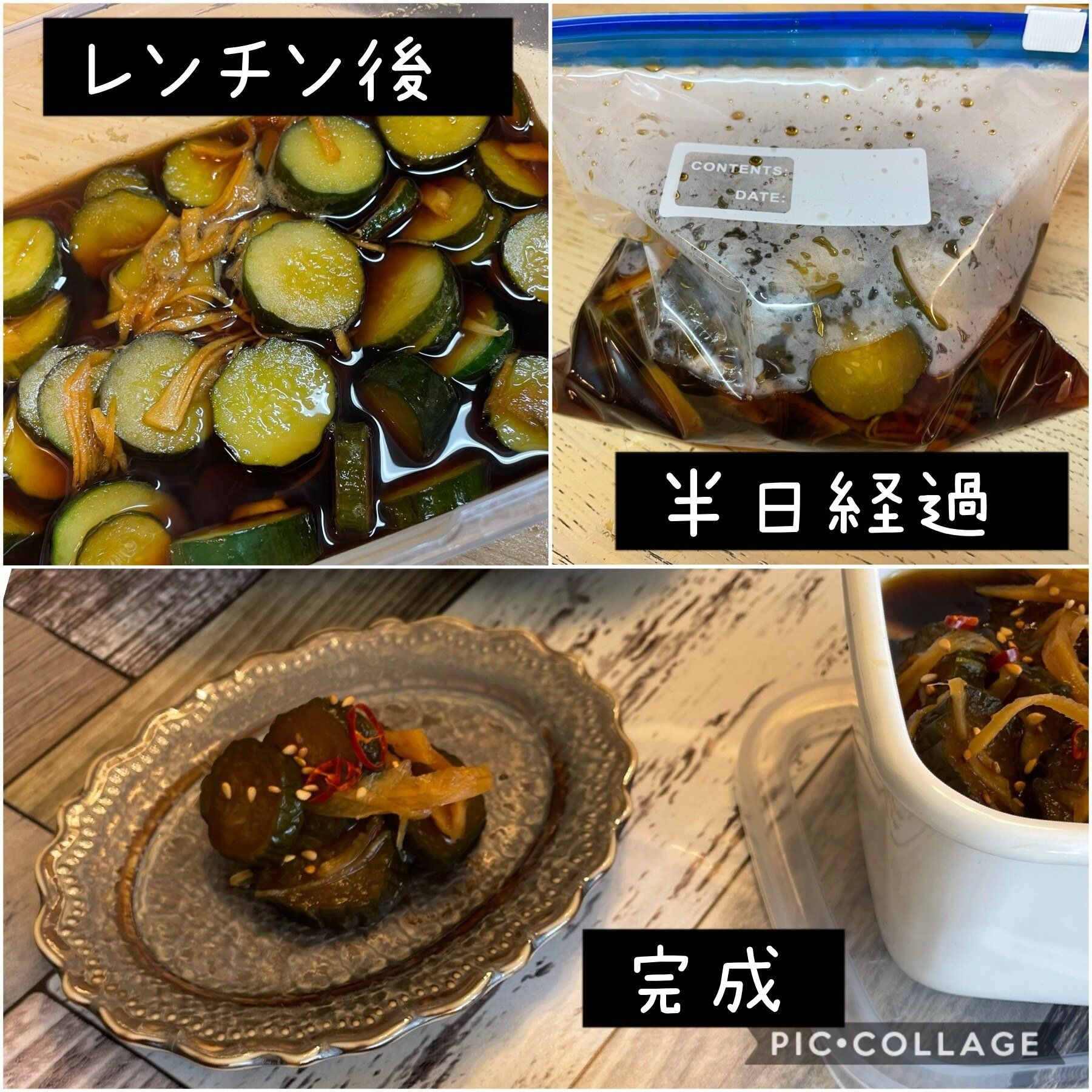 5)ポリ袋で揉んだきゅうりと千切りした生姜・調味液を耐熱容器に入れて、軽く混ぜ合わせたら600Wでレンチン10分程度