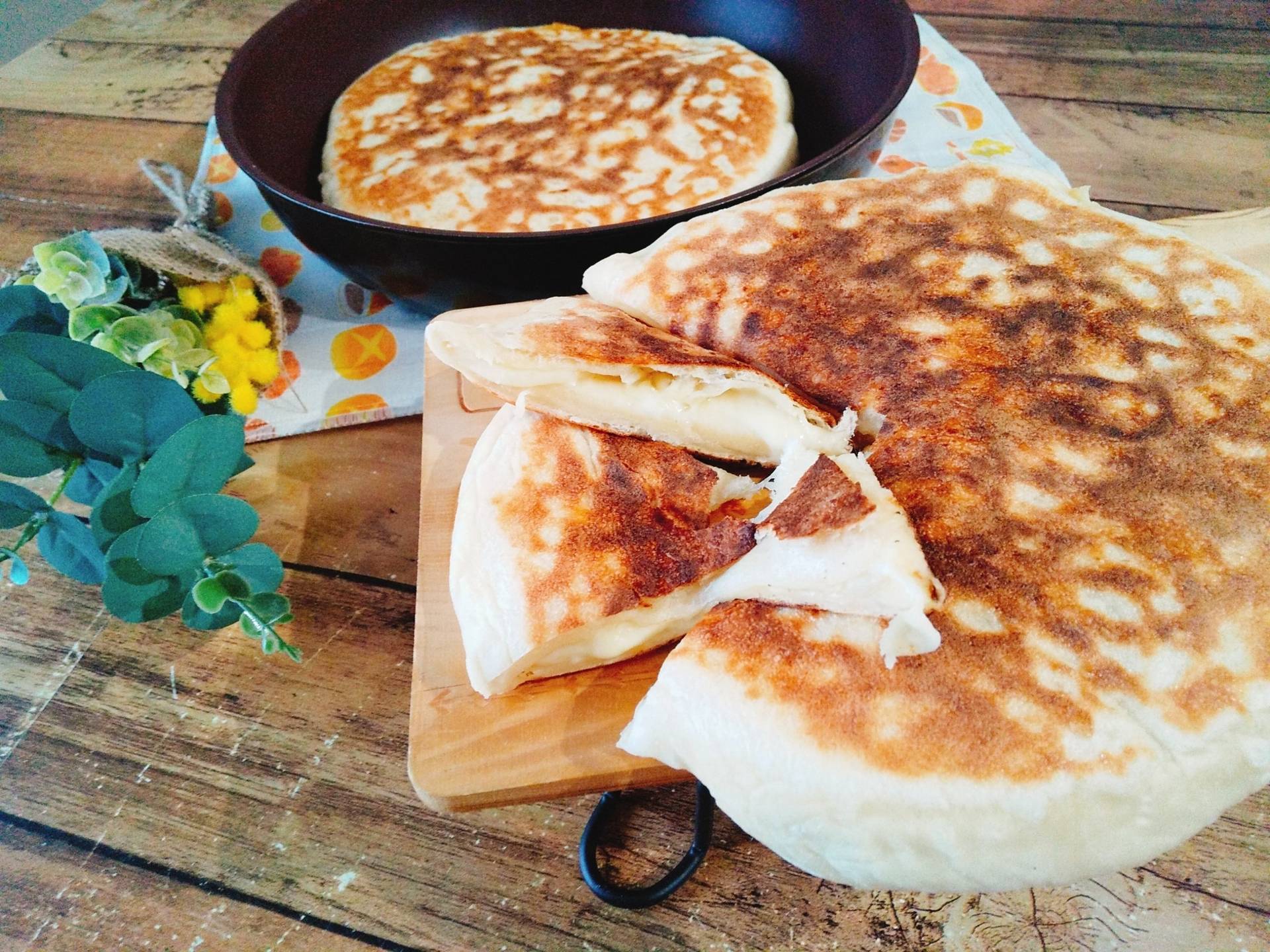 写真のチーズナンは、生地を大きく伸ばしてチーズを入れて包み、更に平たくフライパンくらいの大きさに伸ばして、フライパンで弱火で両面こんがりするまで焼くだけ。