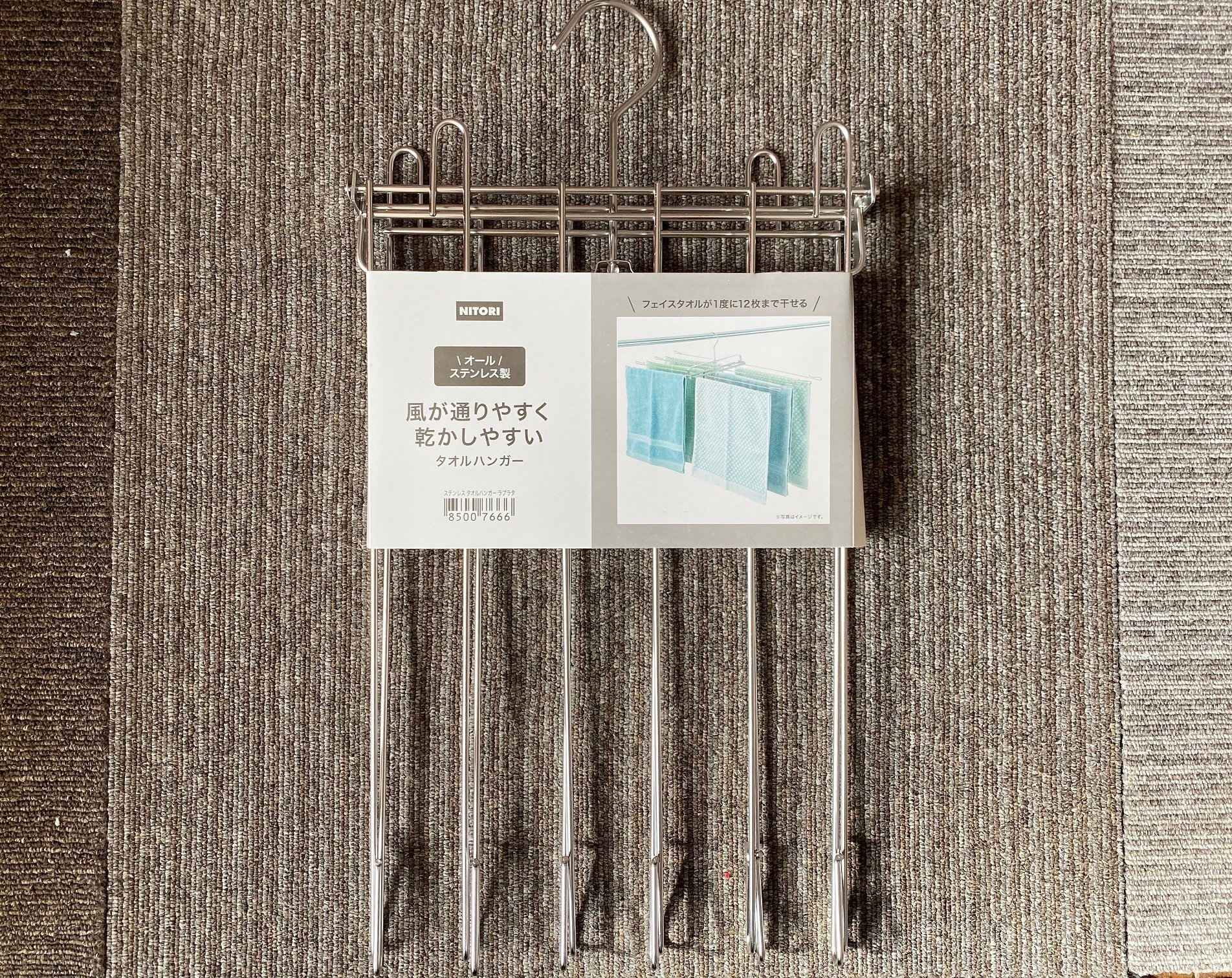 今回ご紹介するのは、ニトリの「オールステンレスタオルハンガー ラタプタ」。価格は1,657円です。パッケージには「風が通りやすく 乾かしやすい タオルハンガー」と書いてあります。