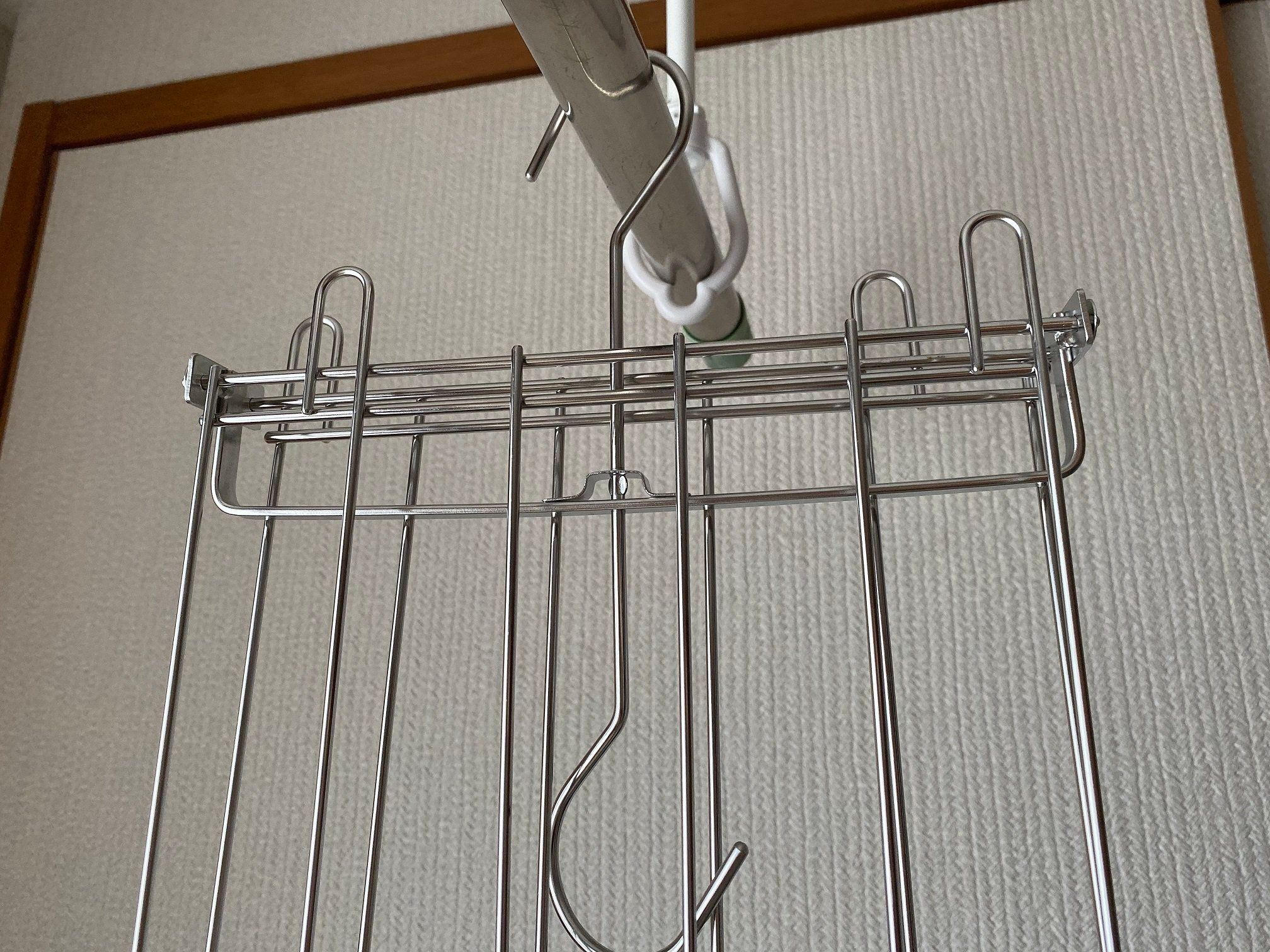 折りたためばそのままかけられます。コンパクトになるのと、たたんでもハンガーが反対側にもついているのでポールに引っかけての収納も可能。わが家では室内干しにも使っています。