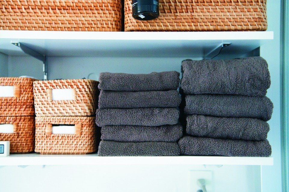 洗濯機で乾燥したタオルや下着は、すぐ上の棚に収納(宇高さん宅)
