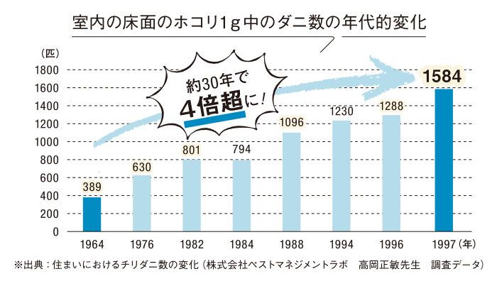 また、室内で見つかるダニの数自体も、約30年で4倍超になっているという調査データもあります。大掃除のシーズンでもある12月。いまいちど、ダニ対策をおさらいしましょう!
