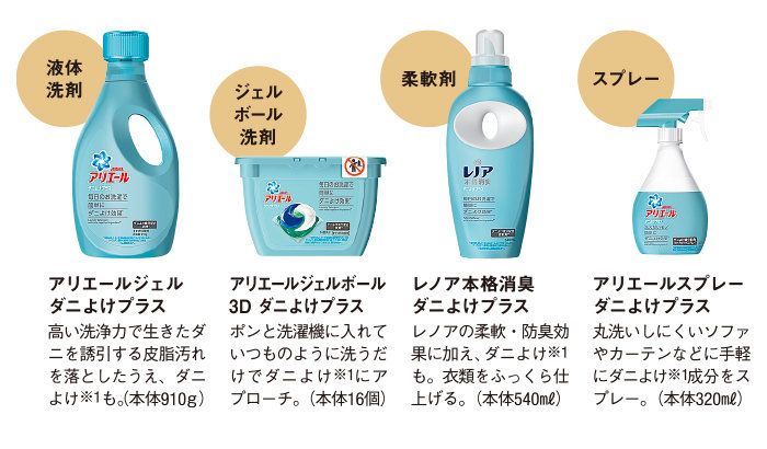 「アリエール ダニよけプラス」は、液体洗剤のほかにもジェルボール洗剤、柔軟剤、スプレーがラインアップされています。いずれも、衣類や寝具にダニを寄せつけにくくする「ダニよけ(※1)成分」を配合!