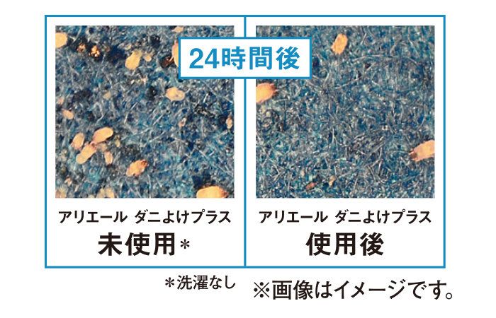 (※1)屋内塵性ダニを寄せつけにくくします。すべてのダニ・素材に効果があるわけではありません。洗剤は1回すすぎ洗濯時。洗剤・柔軟剤は、超薄手を除く綿素材に対してダニを寄せつけにくくします。詳細はAriel.jpをご覧ください。